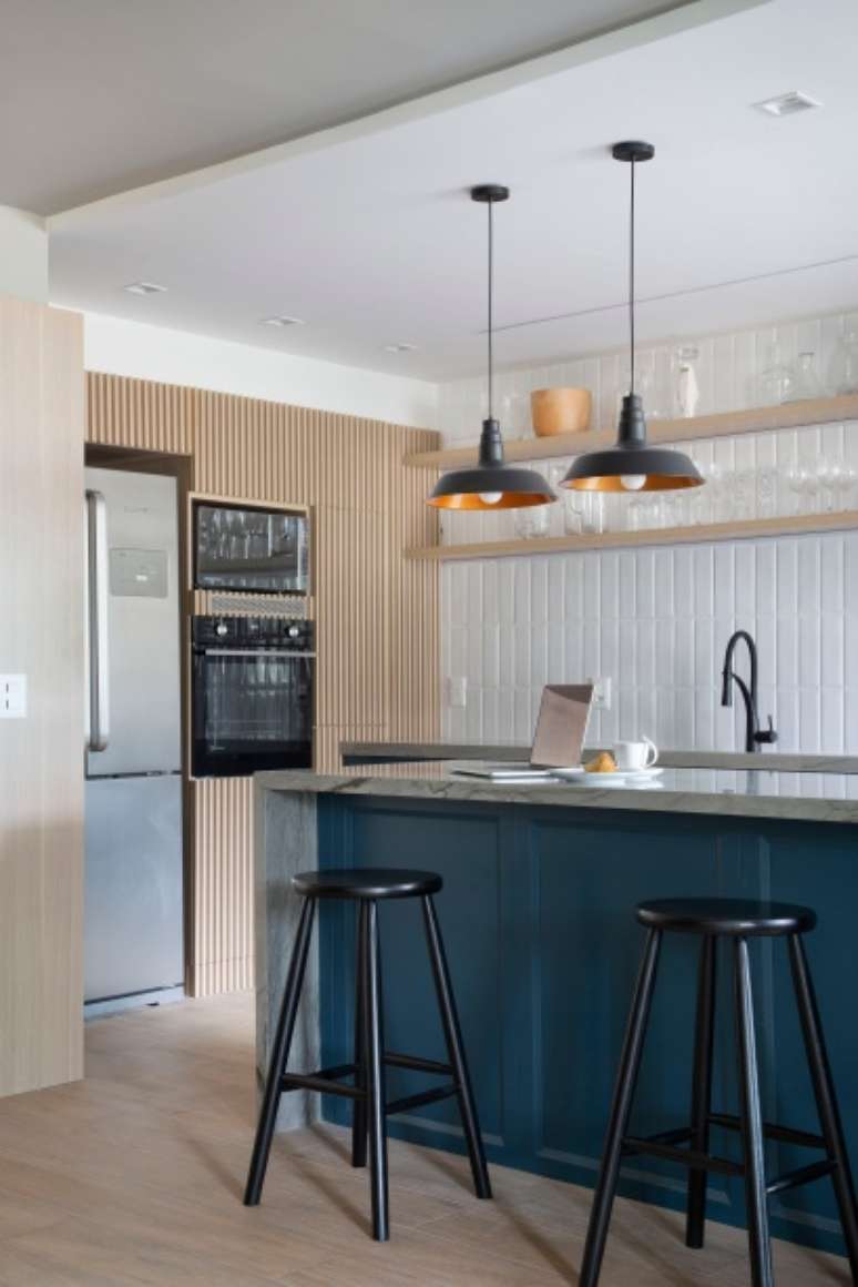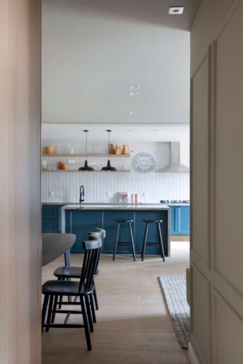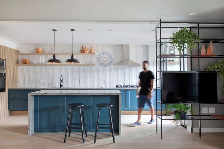 Para ganhar amplitude, criar uma cozinha mais funcional e uma sala mais confortável para reunir a família, o home office e o banheiro de serviço (sem utilidade para o casal) foram eliminados. Com isso, a cozinha foi totalmente integrada à área social, com uma grande bancada em ilha no meio.