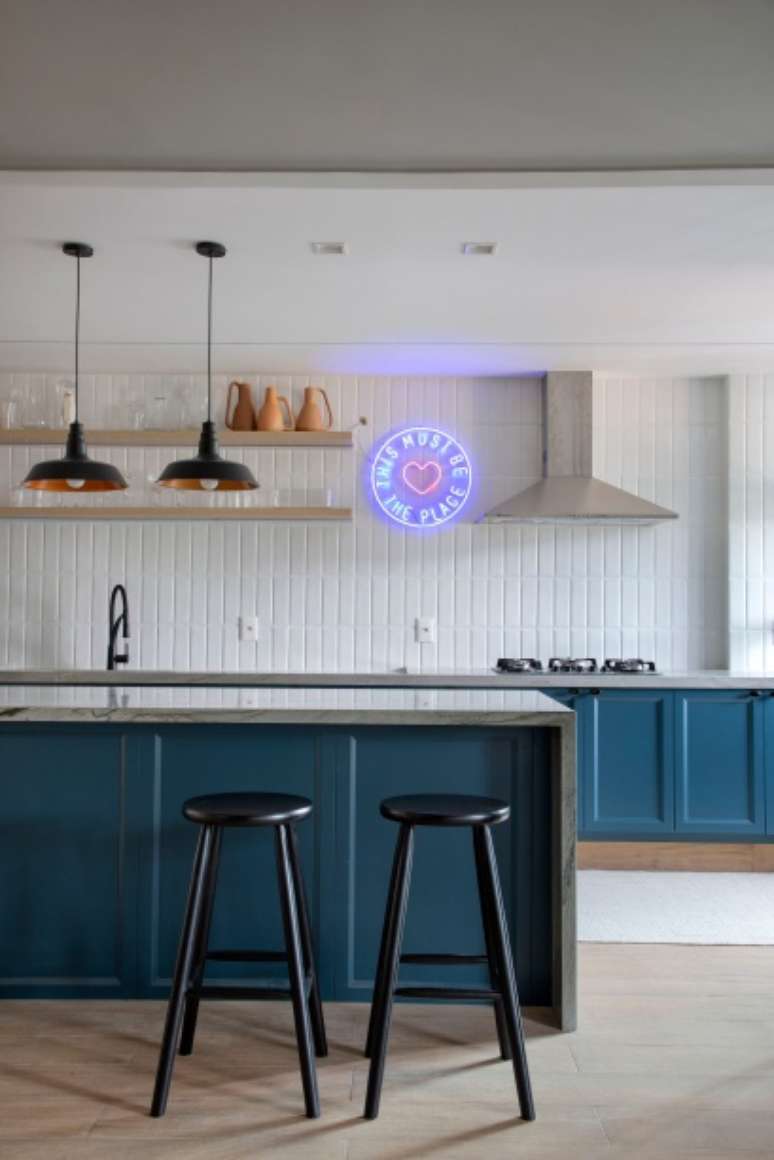 O toque do estilo industrial aparece no acabamento em cimento queimado aplicado no pilar da sala e na parede superior das paredes dos banheiros, e nos azulejos brancos tipo metrô style que revestem a parede ao fundo da cozinha e atrás da bancada do banheiro.
