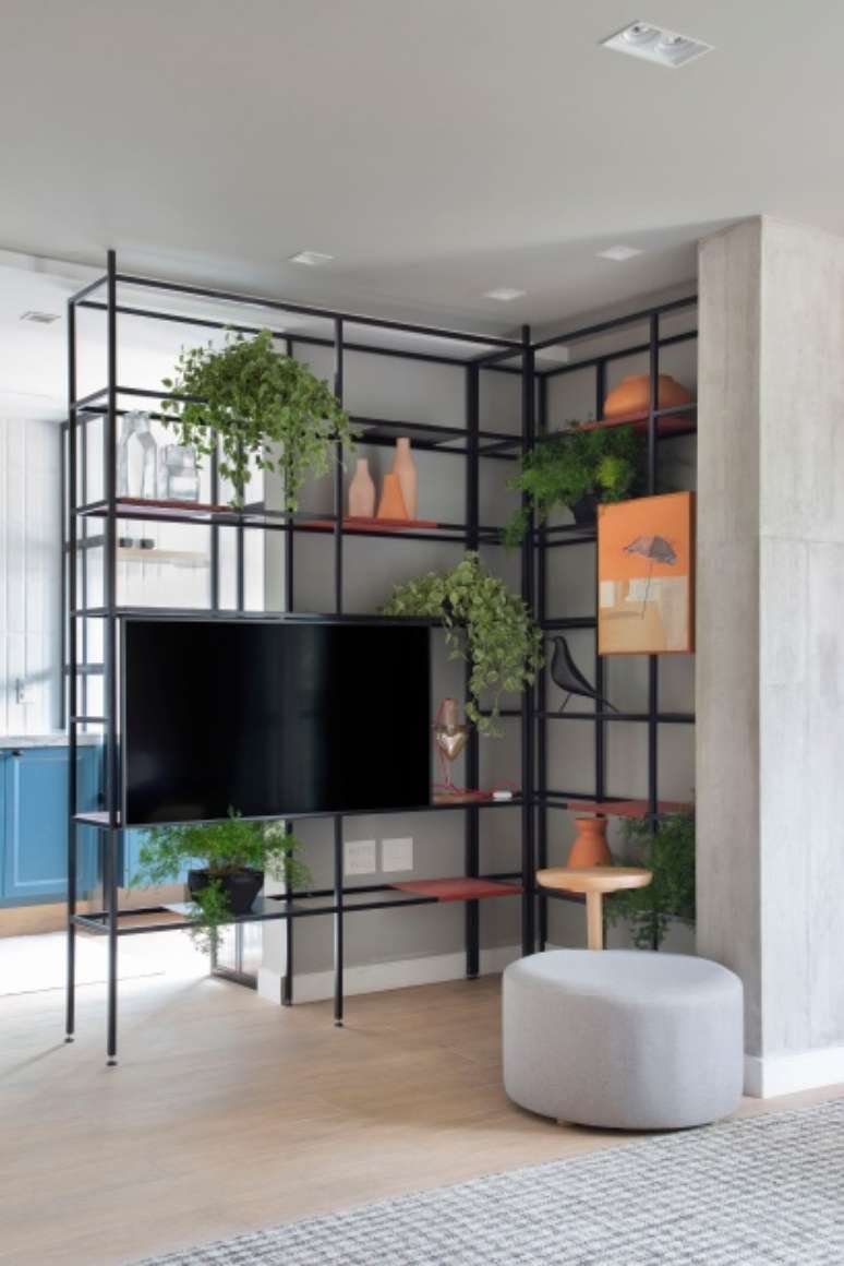 "Essa estante foi um elemento estratégico para ampliar a sala e criar um cantinho. Ela também ajudou a disfarçar um pilar existente, que ganhou acabamento em cimento queimado", explica o arquiteto Cadé Marino.