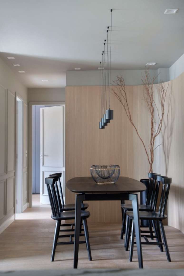 No geral, o escritório elegeu uma paleta de cores sóbrias para transmitir elegância. Executado em marcenaria, o painel de parede curvo que "abraça" a sala de jantar e vai até a cozinha não só deixou o espaço mais acolhedor como também ajudou a esconder os pilares das paredes.