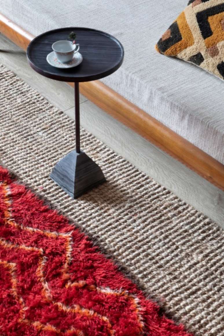As três cores predominantes no décor da área social são tonalidades quentes (uma combinação de vermelho, verde e azul) que a arquiteta adora e gosta de explorar em seus projetos pelas inúmeras sensações provocadas por cada uma delas.
