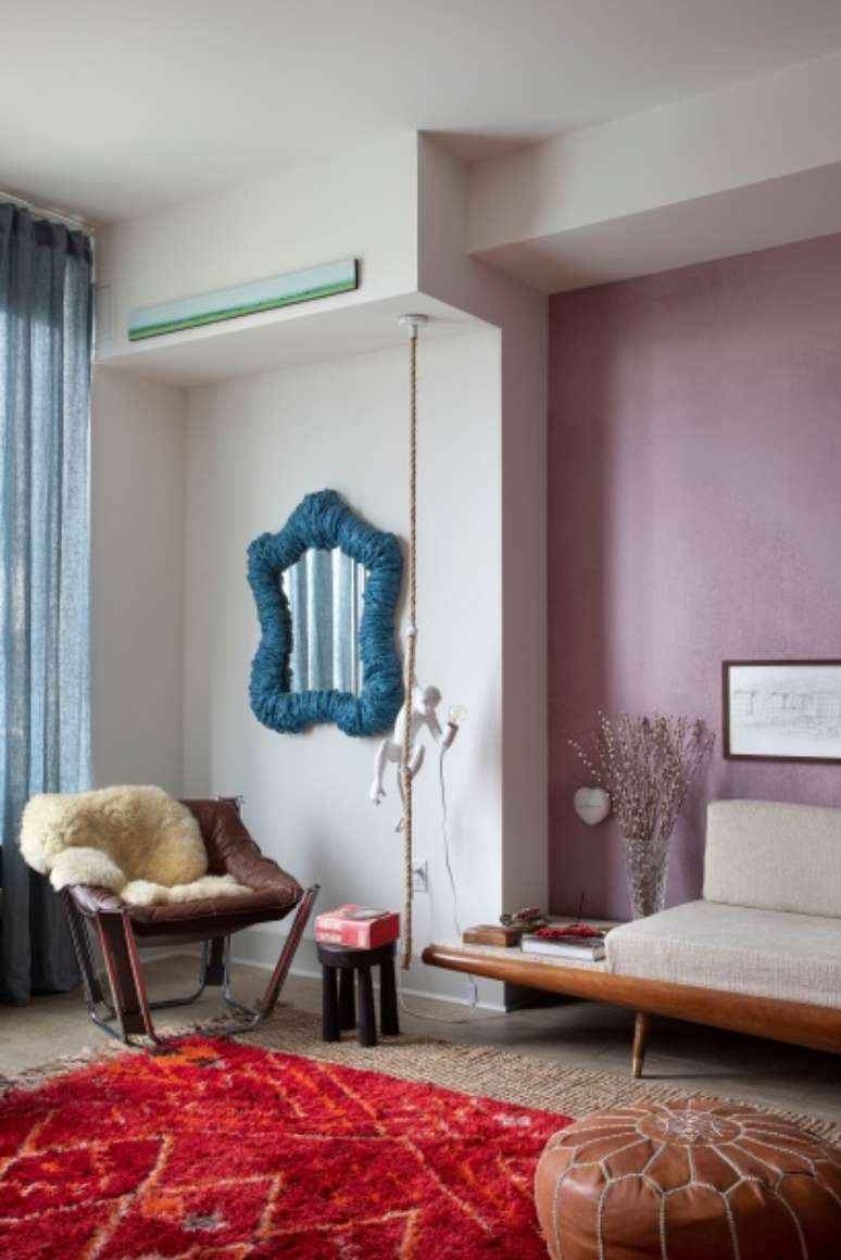 O papel de parede da maior parede da sala, por exemplo, imita a técnica limewash, assumindo um tom que parece ser uma mescla entre os azuis encontrados na sala e o vermelho do tapete.