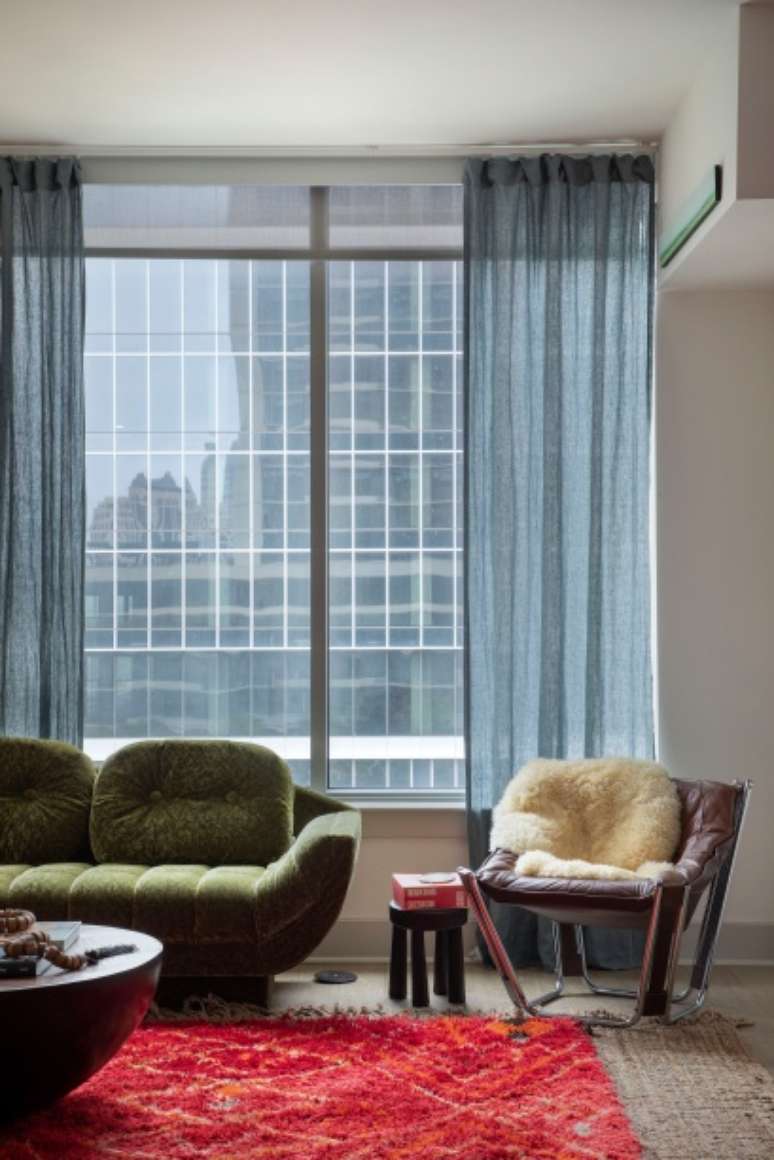 O sofá verde, por exemplo, é o modelo Gondola, criado por Adrian Pearsall em 1970, encontrado no Instagram de uma loja de móveis vintage, em Nova Jérsei. A luminária ao lado dele é, na verdade, um chapéu africano, comprado em uma feira de antiguidades no Texas, à beira da estrada, enquanto sua base foi garimpada em Austin, em uma loja chamada Revival Vintage.