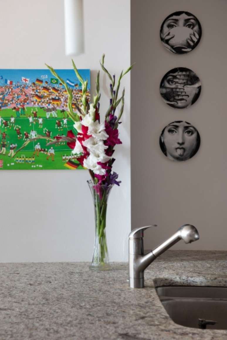 A mesa de jantar, antes marrom escuro, foi pintada em tom nude para não pesar visualmente no espaço. Ainda na sala, o pequeno móvel rosado, em Trencandís (técnica que consiste na criação de uma espécie de mosaico com pedaços irregulares), também foi comprada em Round Rock para fazer par com o quadro do artista Charles Fazzino.