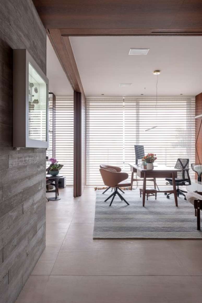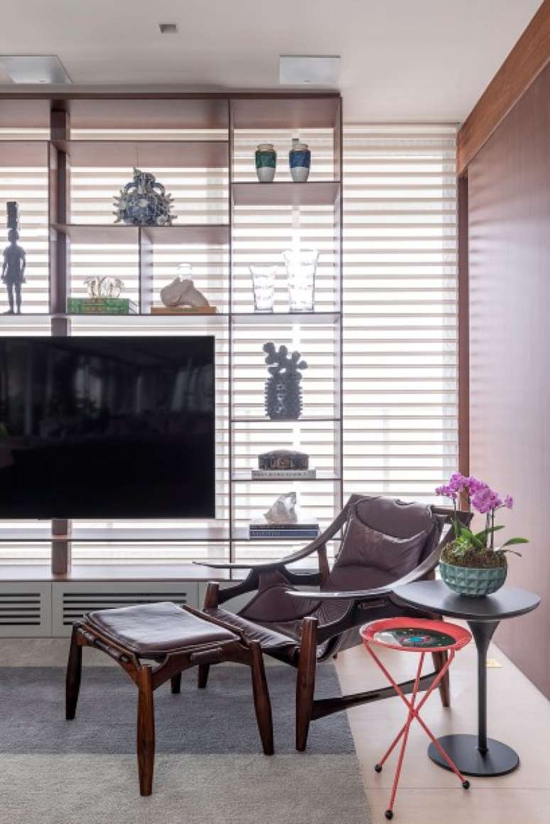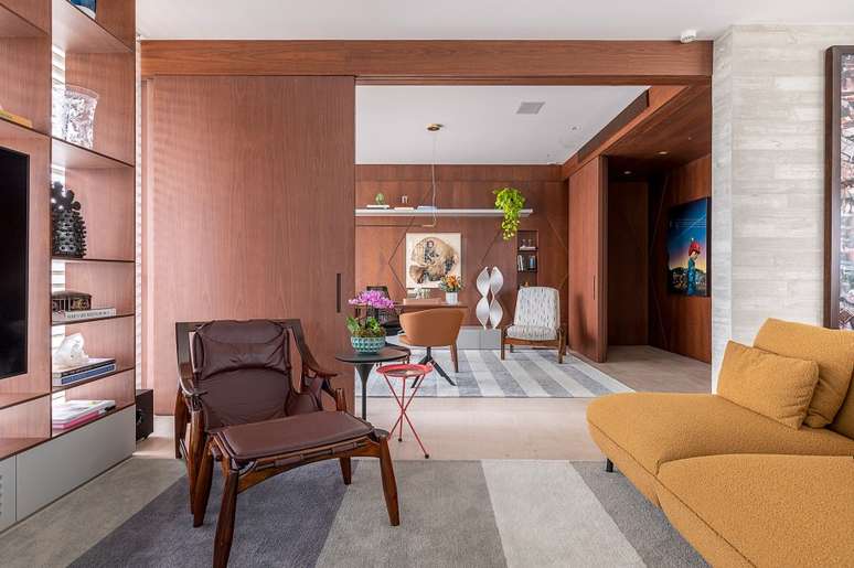 Na paleta de materiais, há limestone vermont para o piso, ripas de concreto nas paredes da sala e muitos painéis em madeira de sucupira.