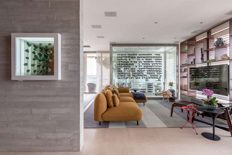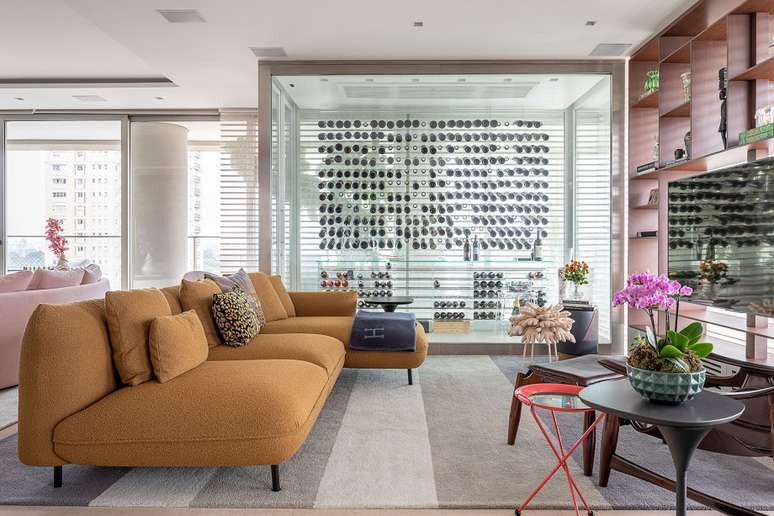 "Os sofás cor de rosa, com certeza são pontos de destaque, bem como a adega toda em vidro para aproximadamente mil garrafas", conta Ana. A estrutura ganha ainda mais destaque com a iluminação natural.