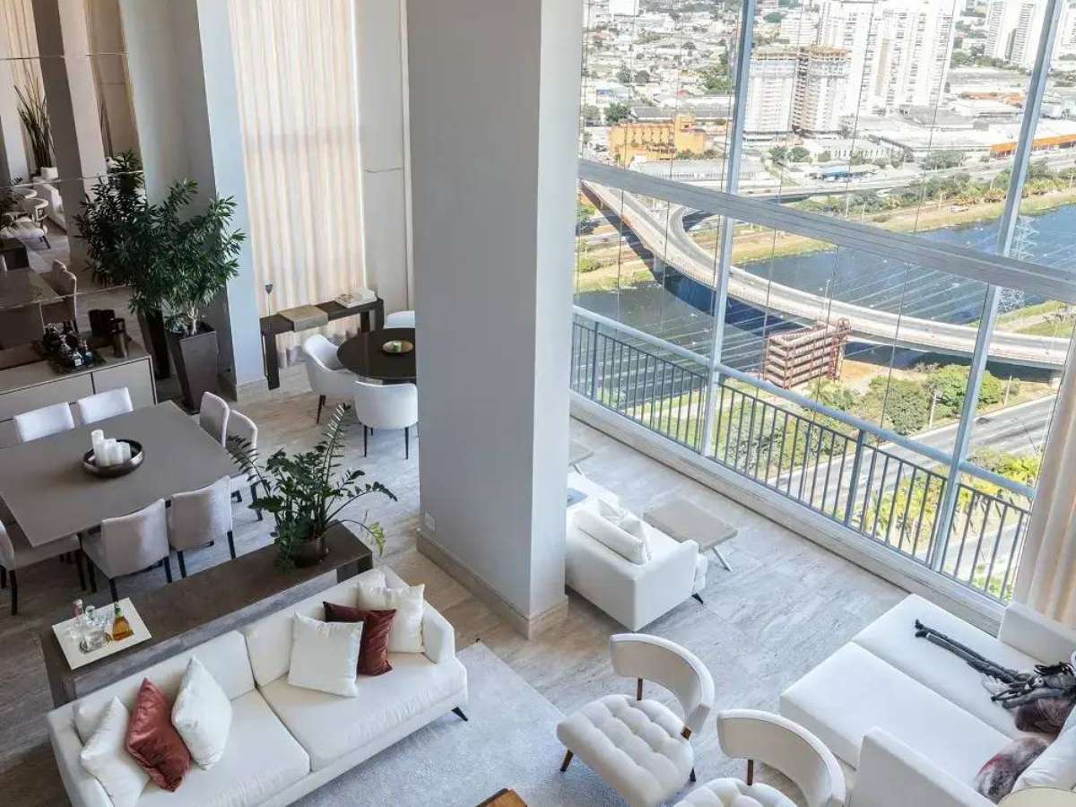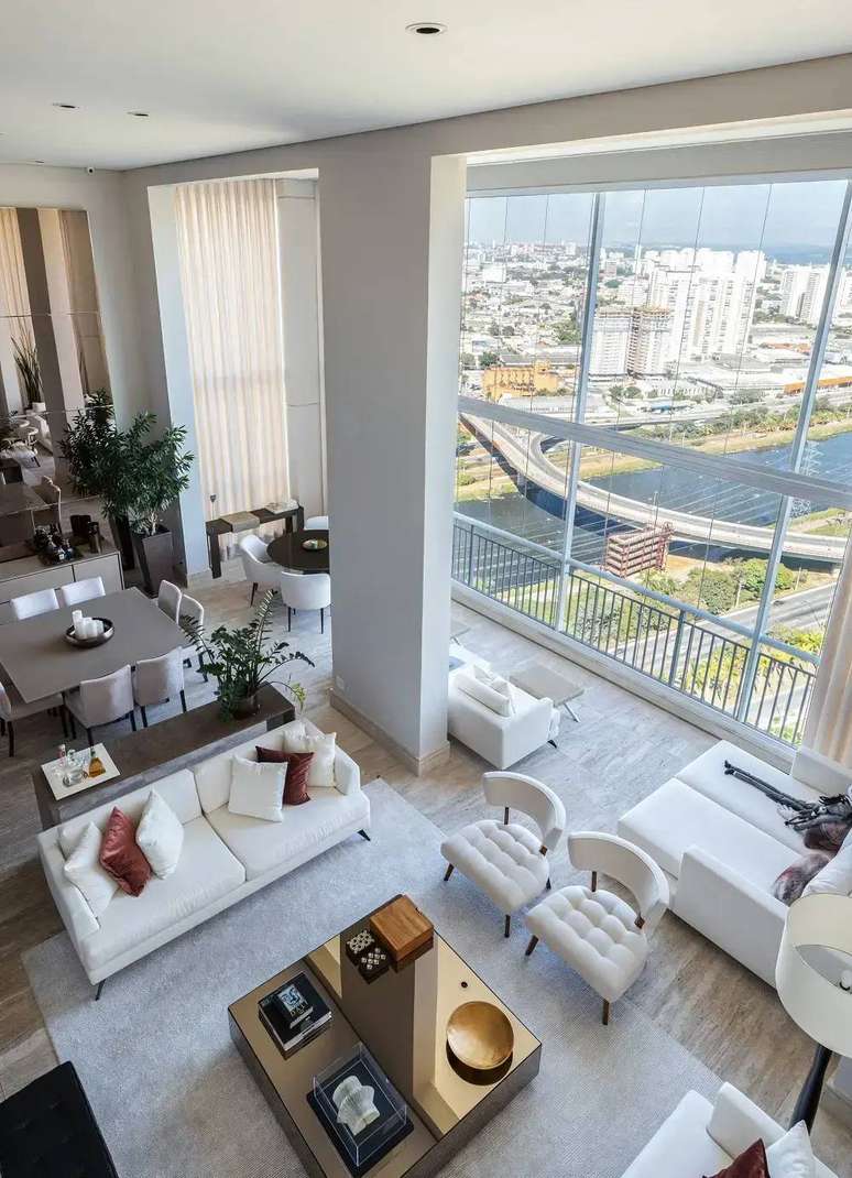 Para valorizar ainda mais a presença do pé direito duplo de 5 m do imóvel, foi necessário buscar alternativas para que os espaços de living, sala de jantar e varanda se tornassem um ambiente único. Dessa maneira, as arquitetas optaram por retirar as portas que separavam a varanda do resto do apartamento duplex e integraram todos os ambientes.