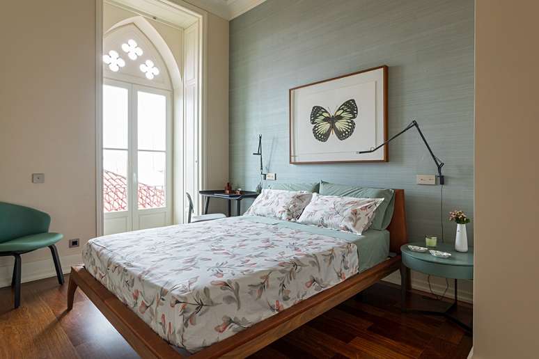 Nas paredes, que ganharam um tom forte de azul, chamam atenção duas obras: um quadro de Manoel Novello, levado do Brasil pela proprietária, e um painel de azulejos do século XVIII comprado num antiquário de Lisboa.