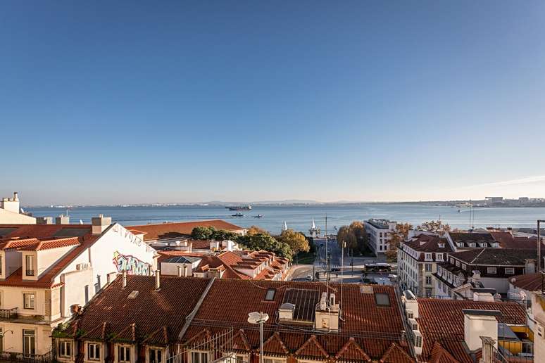 A opção foi por um décor bem contemporâneo que contrasta com as portas e janelas originais, em arco, de onde se tem uma bela vista para o rio Tejo. Como há apenas uma sala, que serve para a TV e para receber, o mobiliário foi escolhido para ter múltiplas funções: poltronas para leitura, para uma roda de conversa, sofá confortável, mesinhas de apoio.