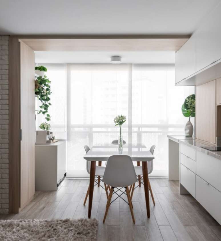 Para este apartamento studio de 31 m², localizado na Vila Olímpia (SP), o grande desafio da arquiteta Renata Naomi Narimatu, do Estúdio Rena Arquitetura e Design, foi a integração total da cozinha, varanda/jantar, sala de estar e quarto, de modo harmônico e funcional.