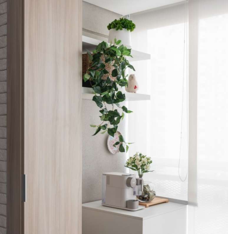 O desejo da jovem cliente era ter o máximo de amplitude e aproveitamento dos espaços possíveis, um cantinho do café, além de um apê com estilo escandinavo com toques boho e contemporâneo.
