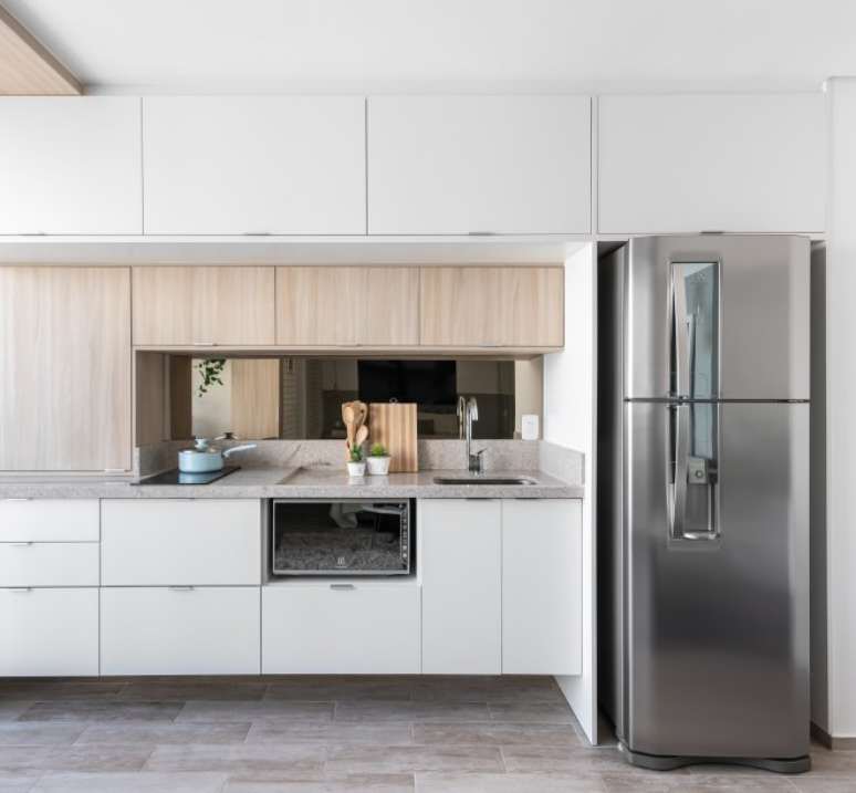 Por fim, para garantir maior sensação de amplitude, os espelhos foram distribuídos estrategicamente pelo apartamento, sendo incolores nas portas do armário embutido do quarto e bronze no backsplash da cozinha.