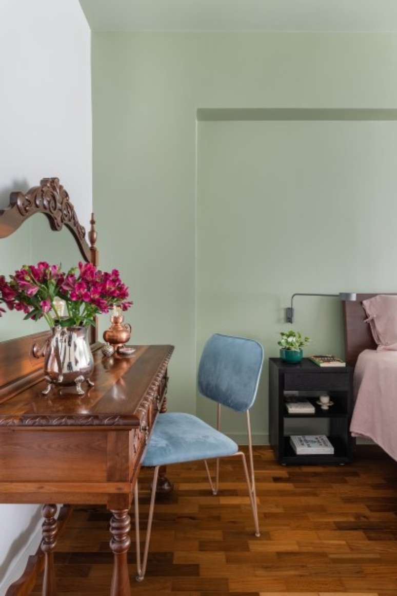 A arquiteta ressalta também a mistura de peças novas e antigas no mobiliário. "No meu quarto, a cama de casal e as mesas de cabeceira foram desenhadas por mim, mas estão ladeadas pela penteadeira da minha avó e pelo sofá de mola do irmão dela", finaliza.