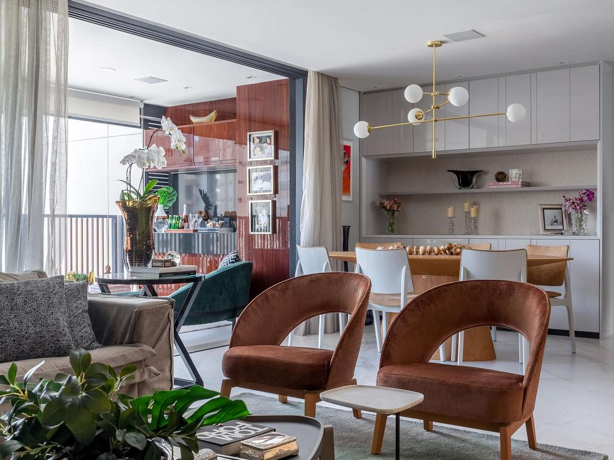 Pensando na área social, o desejo da profissional era que o ambiente fosse todo integrado, englobando assim a varanda gourmet e a sala de jantar. O resultado final não ficou só harmônico e fluído, como também ganhou uma automação personalizada: toda a iluminação do ambiente, o aparelho de ar-condicionado e até a TV - que ficou envolvida pelo grande painel de madeira que esconde as portas mimetizadas do lavabo e das suítes - são controlados por assistentes eletrônicas. O controle acontece pelo celular, tablet ou também por comando de voz.