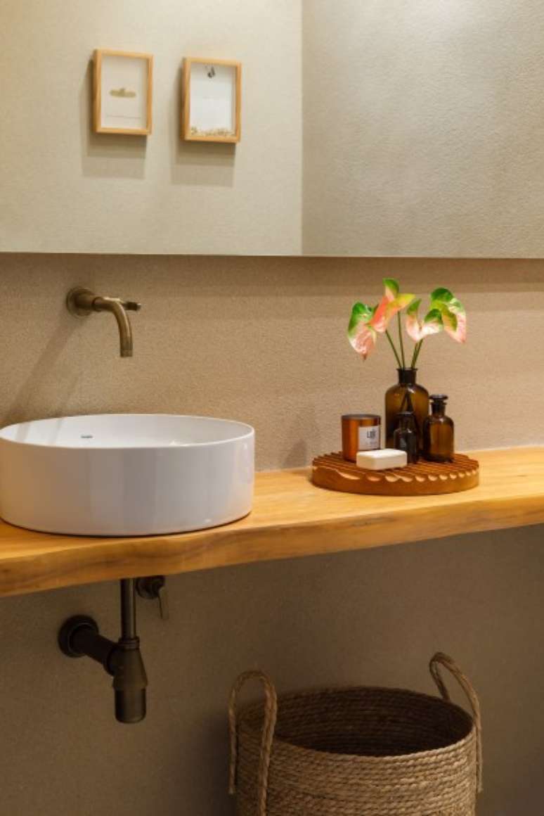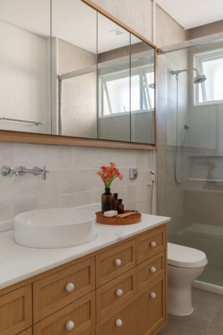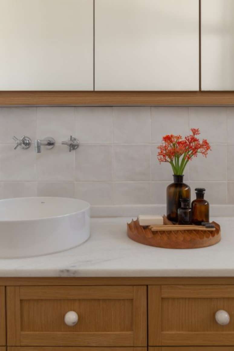 No banheiro, o revestimento Gouache Nuage (da Portobello) aparece em dois tamanhos diferentes (um para cada banheiro, porém da mesma cor). Por remeter às cerâmicas antigas, a irregularidade de sua superfície garante um aspecto mais rústico e artesanal. A bancada de mármore branco especial é complementada pelo armário laminado e pelos puxadores de mármore da Zara Home.