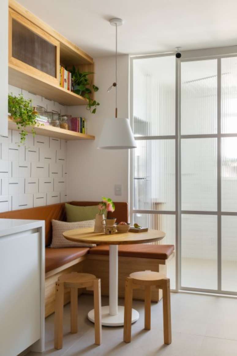 A porta metálica com vidro canelado também traz textura e luz para copa, pensada como canto alemão, com mesa feita sob medida, pendente mini Vinte da Lumini e bancos Girafa da marcenaria Baraúna para agregar mais pessoas.