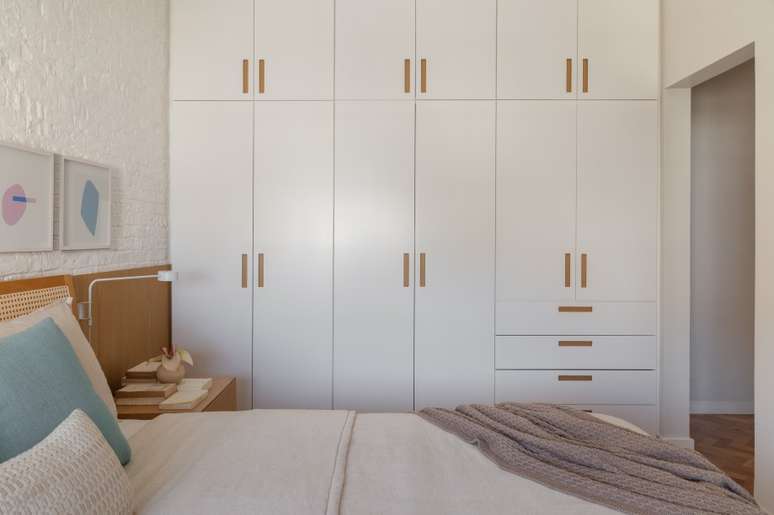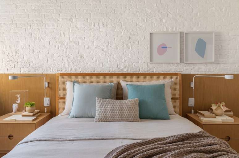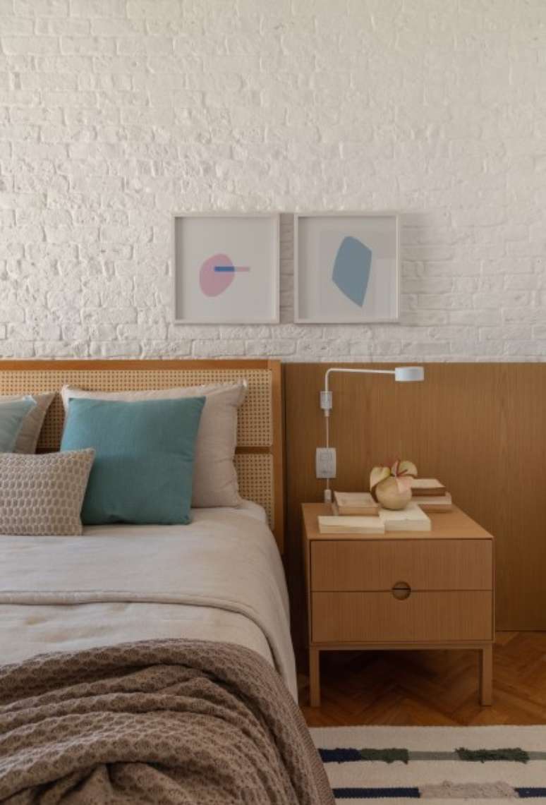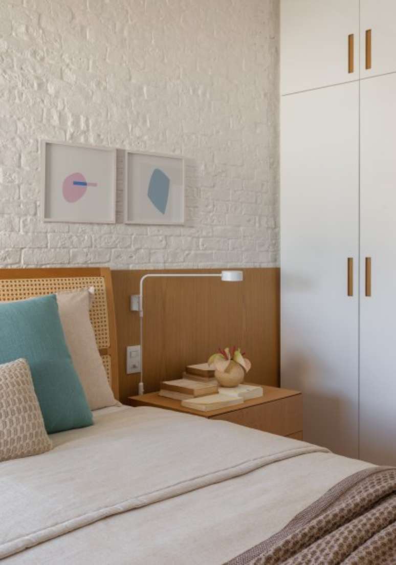 Para trazer nova textura para parede branca do quarto, o revestimento brick da Passeio foi instalado acima da cabeceira de madeira, mantendo a paleta predominante do projeto. A cama Link da Franccino complementa a composição, com uma cabeceira de tela sextavada e a madeira tauari, que se repete na cabeceira e nas mesinhas de cabeceira.