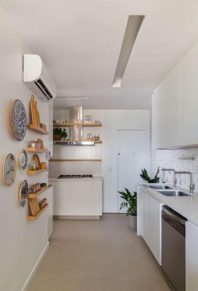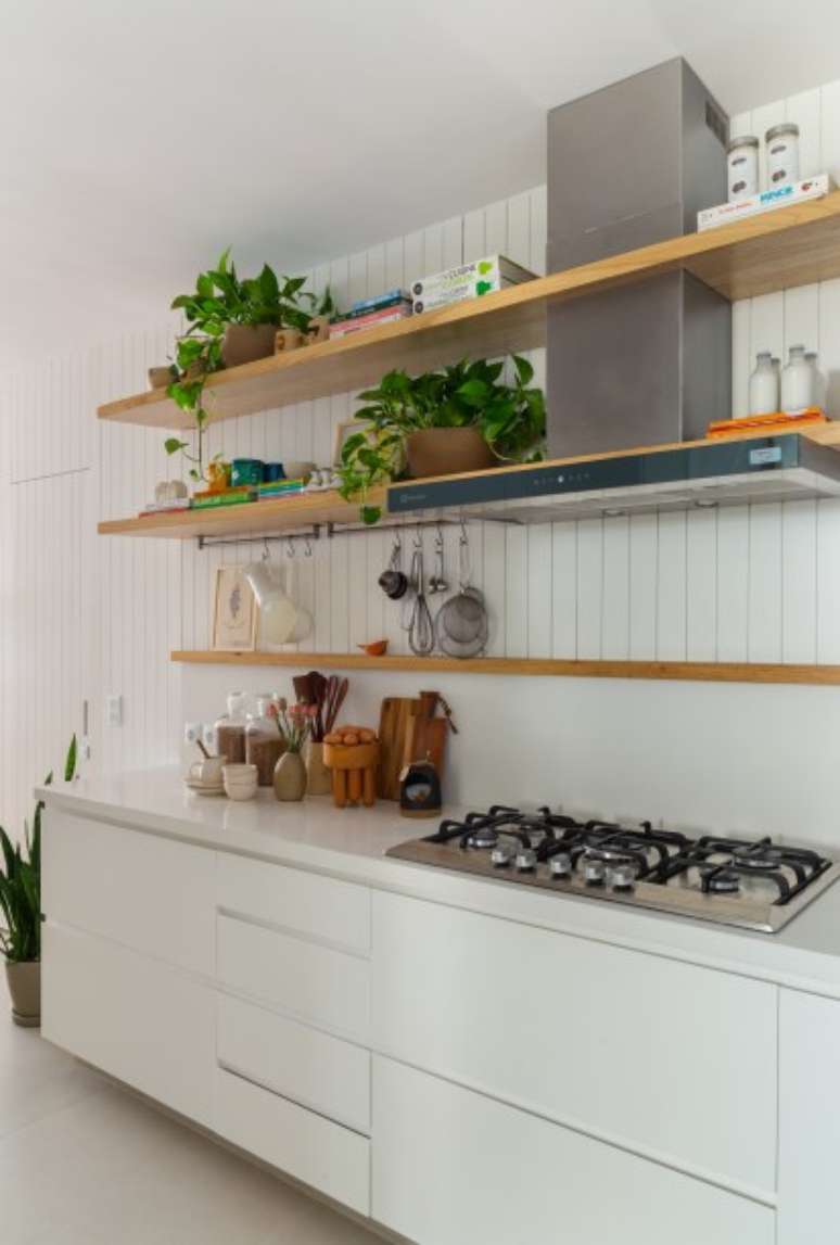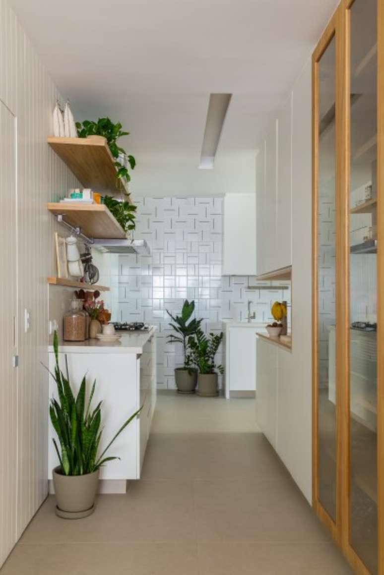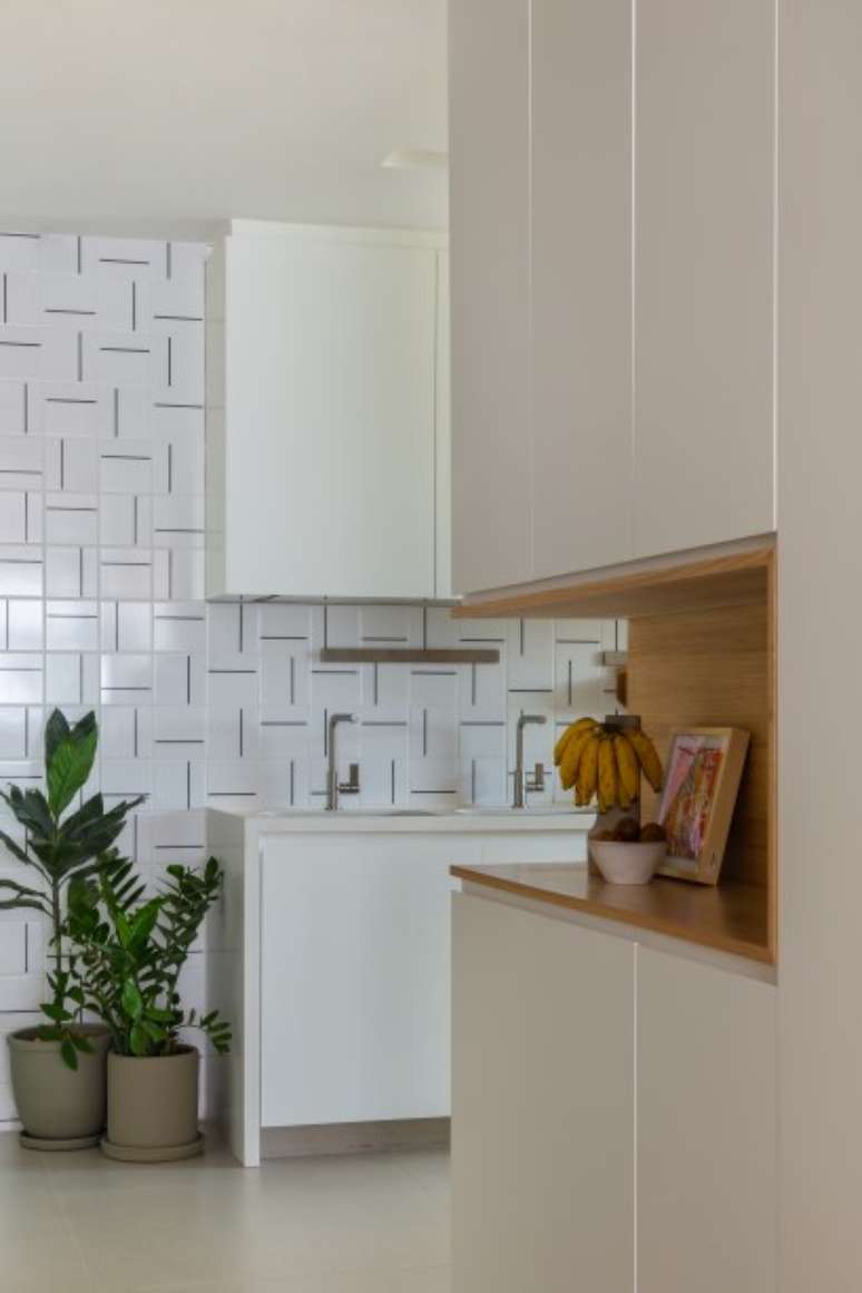 A parede branca da cozinha ganhou texturas diferentes: de um lado, um lambri acima da bancada do cooktop disfarça a porta do lavabo no início do corredor; do outro, os azulejos da linha Eixo da Cubo Azulejaria vestem a superfície acima da bancada molhada.