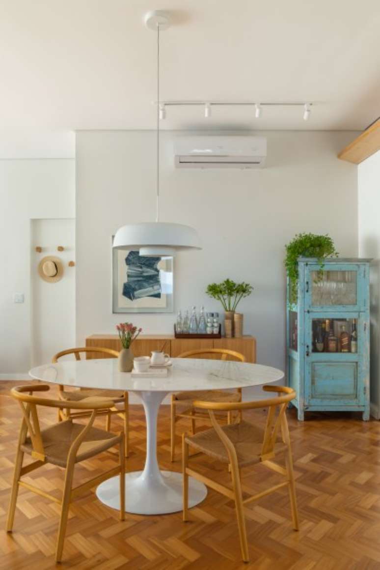 "Reformamos o sofá existente, que era grande e confortável para ver televisão e receber amigos. Também aproveitamos a poltrona Butterfly que eles já tinham, criando um canto para vitrola com iluminação mais intimista fornecida pela arandela", diz o escritório. Na sala de jantar, destaque para cristaleira azul.