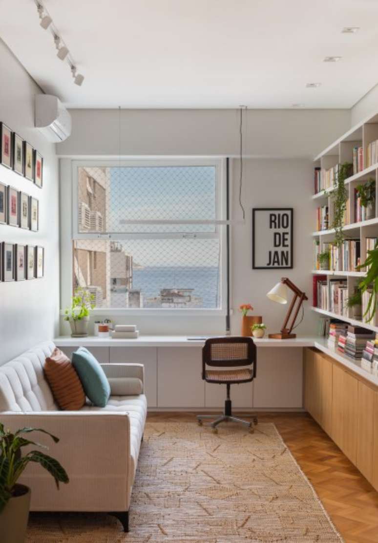 Apê ganha escritório com vista para o mar e texturas nas paredes brancas