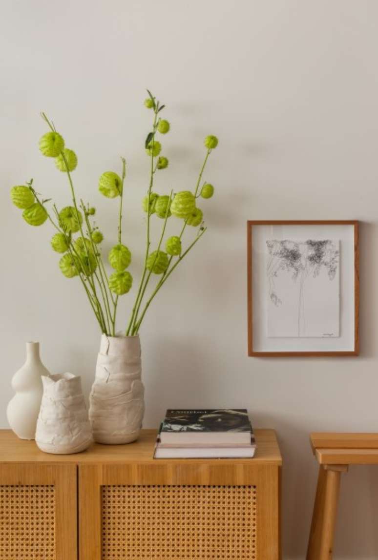 O home office também é versátil: em dia de trabalho ou visita pode ser fechado por uma porta camarão que garante privacidade suficiente para reuniões online ou receber eventuais hóspedes. Porém, quando não é hora de trabalho, ele permanece aberto e passa a fazer parte da sala, como mais um ambiente de uso social. O sofá-cama acomoda hóspedes quando necessário.