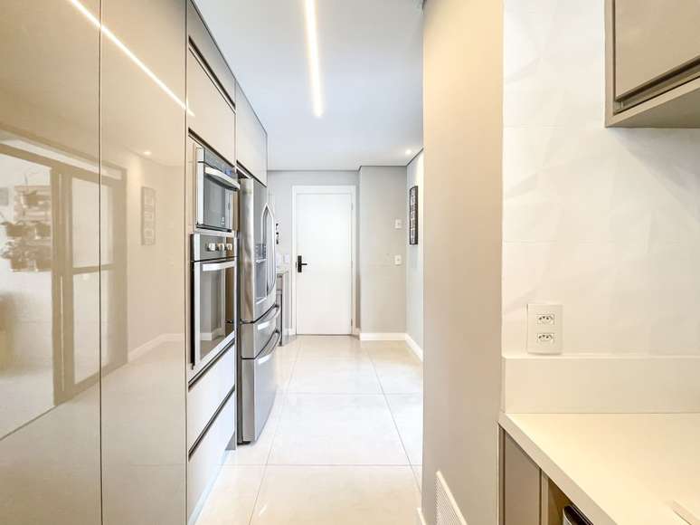 Além da varanda, fechada com vidro, a apartamento também possui uma ampla área externa com acesso pela cozinha. "A grande vantagem desse apartamento foi o quintal amplo. Além da área da churrasqueira, fizemos uma área técnica para máquinas de ar-condicionado e área de serviço.
