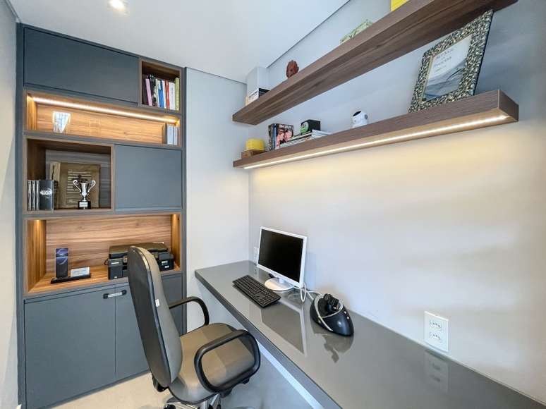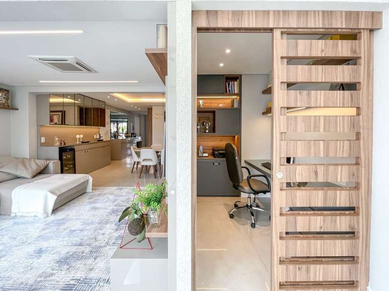 O home theater ganhou um amplo sofá e o painel da TV, além de organizar os eletrônicos, faz a divisa do escritório, garantindo privacidade para a rotina de home office.