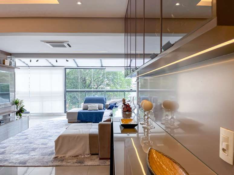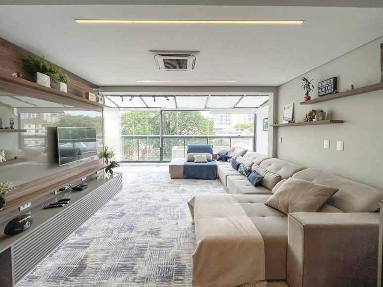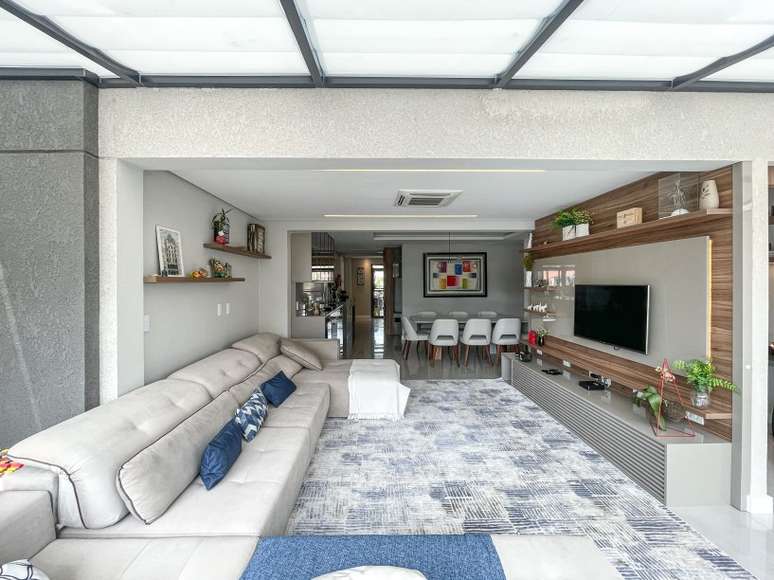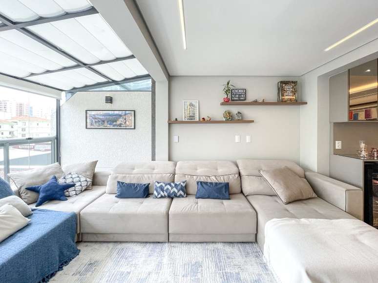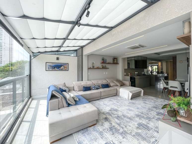 A sala ganhou maior iluminação natural, espaço amplo, e uma decoração neutra e atemporal, garantida pelos tons neutros como o cinza e pelo azul nos detalhes. "Este apartamento teve muitas modificações em relação à planta original. A área social foi ampliada com uma cobertura de vidro e fechamento de sacada", conta Andreia.