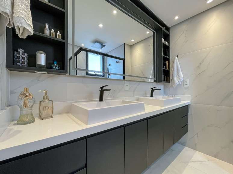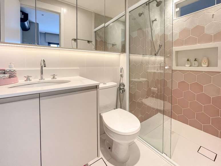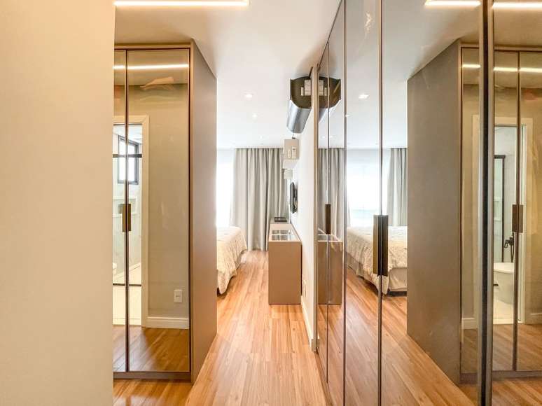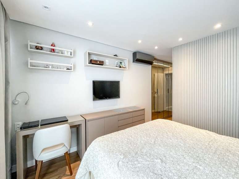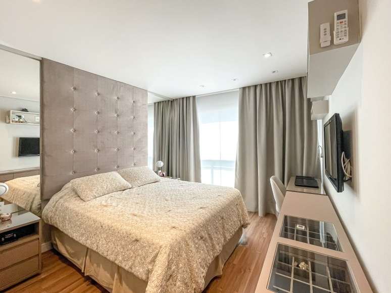 Na suíte do casal, as profissionais integraram a antiga sacada para aumentar o banheiro e criar um closet. As cores claras garantem sofisticação e o painel da cama na parede pode ser usado como cabeceira e também como encosto para descanso.