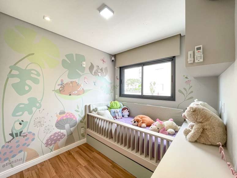 O quarto da filha do casal recebeu atenção especial: com uma arte personalizada, ela pode usufruir de um céu estrelado de fibra óptica durante as noites. Já o papel de parede trouxe uma divertida estampa de floresta.