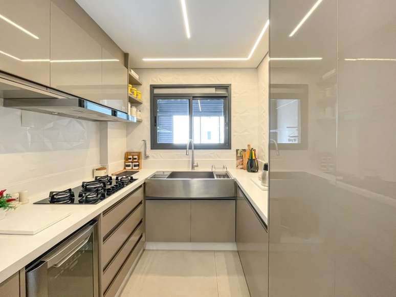 A cozinha recebeu algumas intervenções no layout original para garantir funcionalidade ao espaço. "No local da pia, abrimos uma porta para o quintal e mudamos a posição da cozinha para o local da área de serviço original. O cômodo ficou em formato de U e ganhou uma cuba farm sink feita sob medida", conta Andreia.