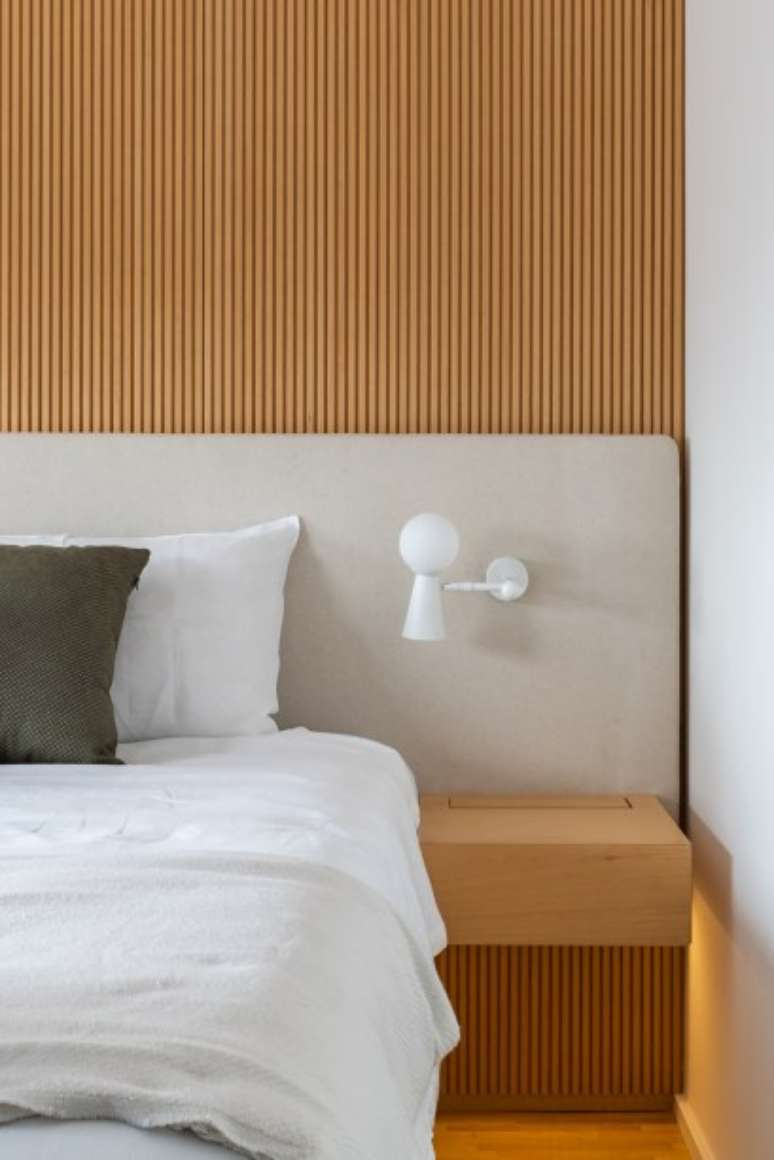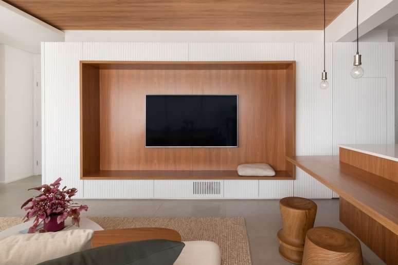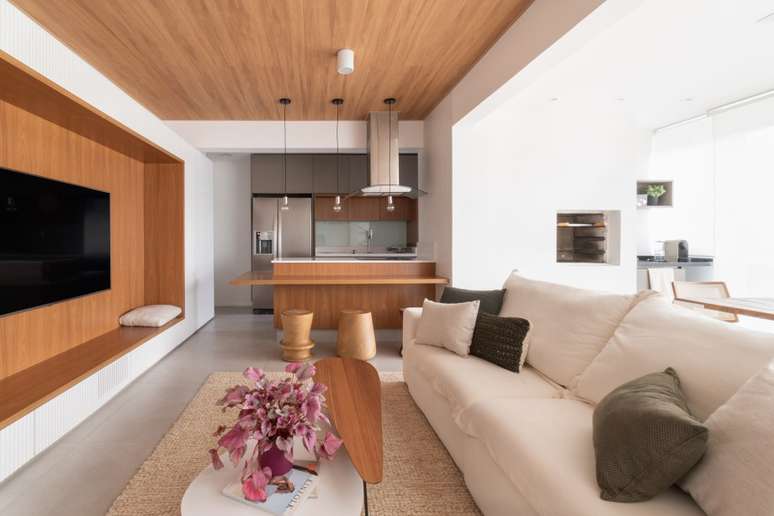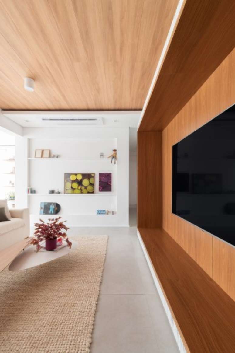 A madeira se contrapõe à estética mais "fria" do piso de porcelanato existente no local, além de trazer aconchego.