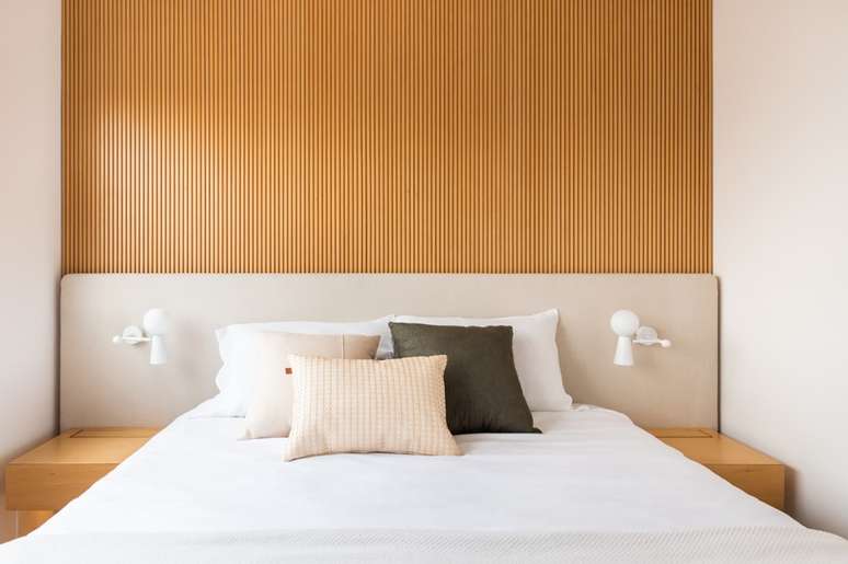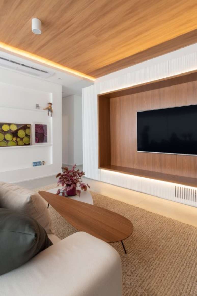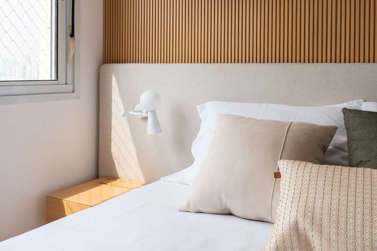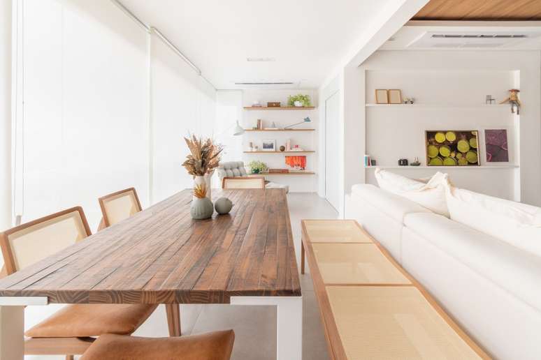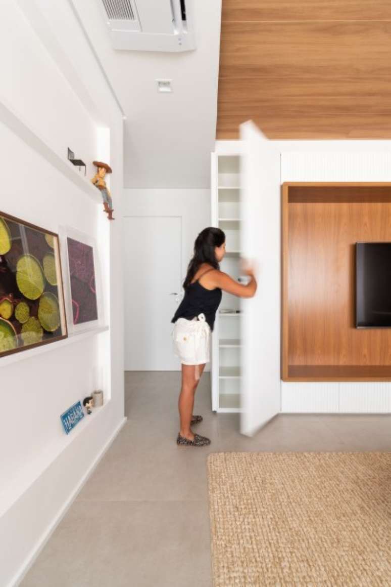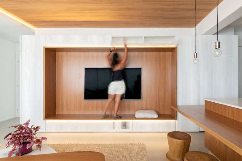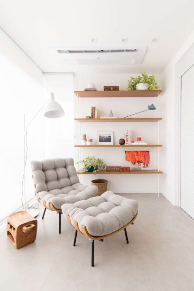 "Optamos também por inverter o layout original do apartamento e criamos um armário grande na sala, que fica escondido por um painel ripado branco - assim seu visual não fica muito pesado", contam os profissionais. O espaço também ganhou um espaço para leitura com poltrona com pufe e estante para livros. "Aqui é o local preferido das cachorras", diverte-se o escritório.