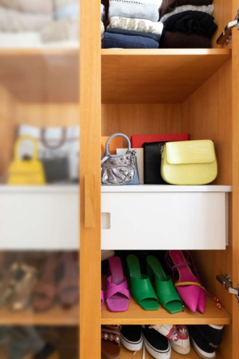 Numa segunda fase da reforma, a suíte principal foi incorporada a um dos quartos e ganhou um closet gigante, com espaço específico para roupas longas, curtas, calças, e um armário inteiramente dedicado a sapatos, bolsas e malhas.
