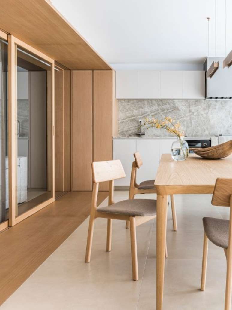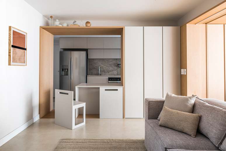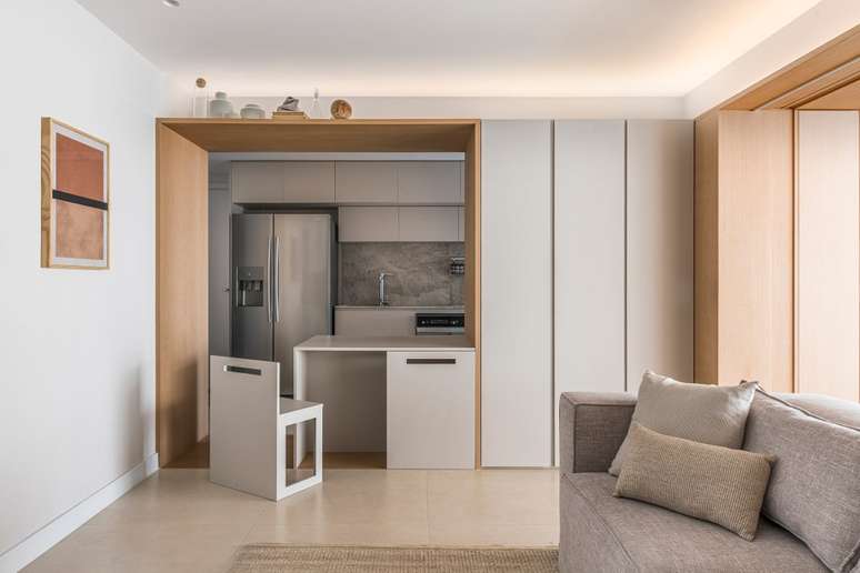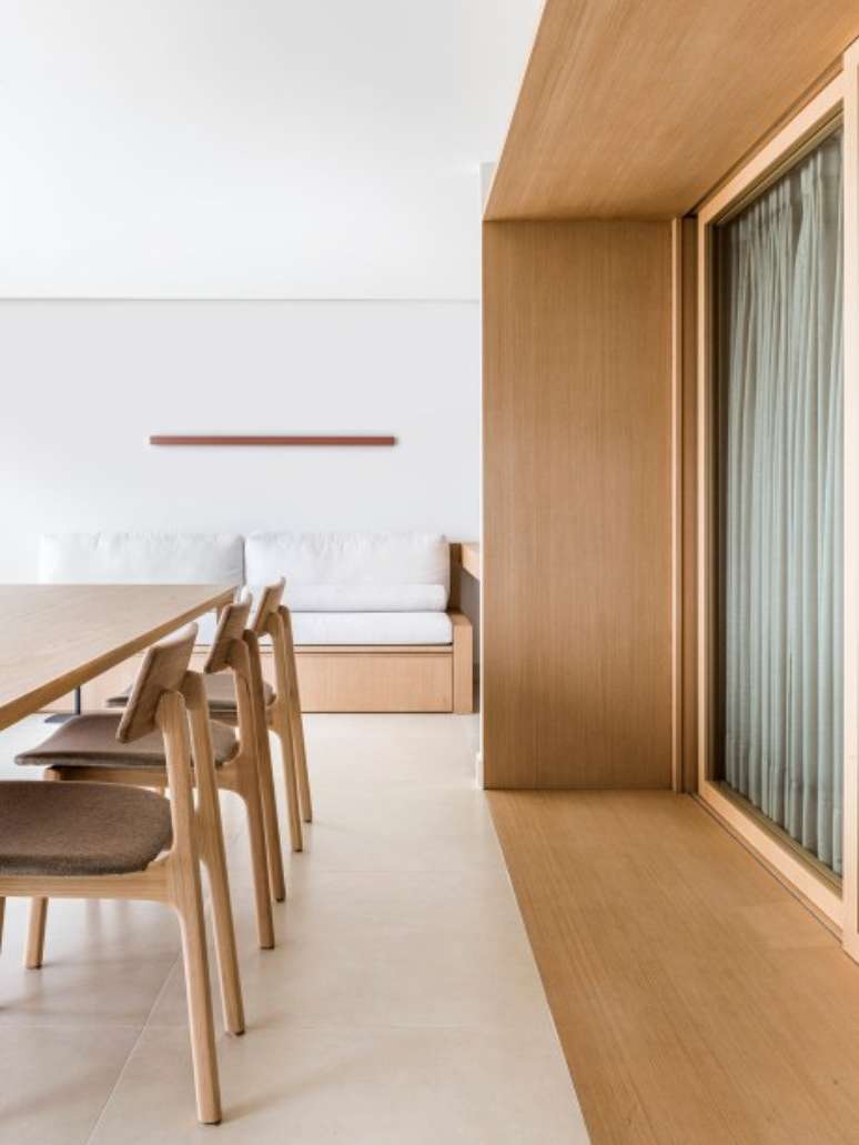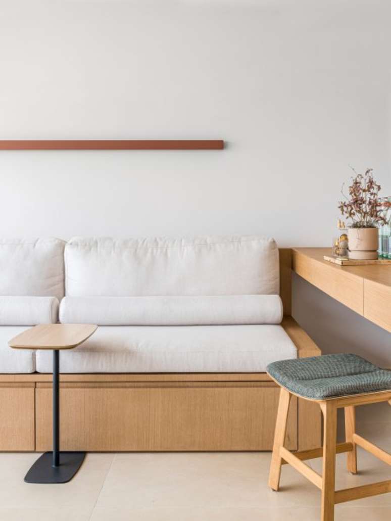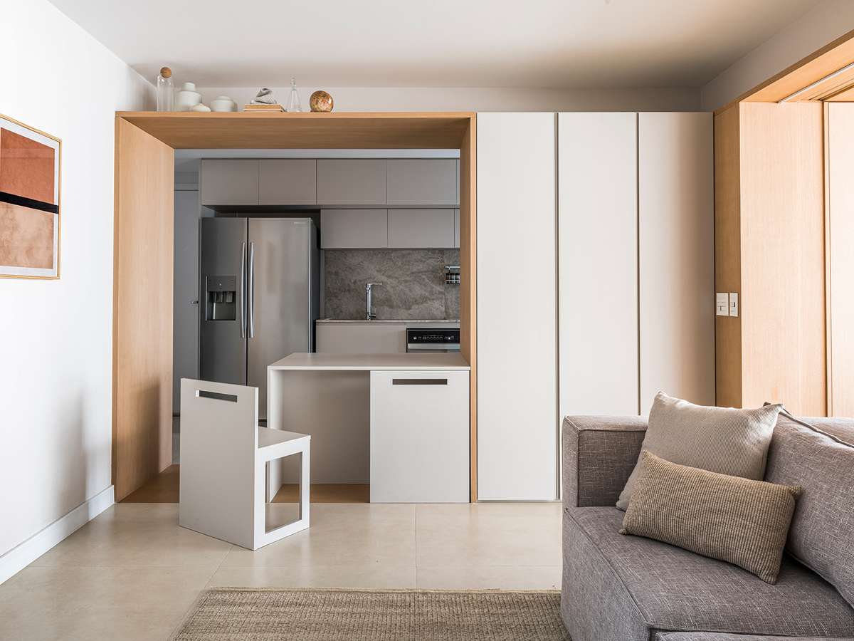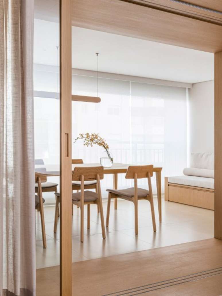 Apê minimalista de 110m² ganha pórtico de madeira entre varanda e sala