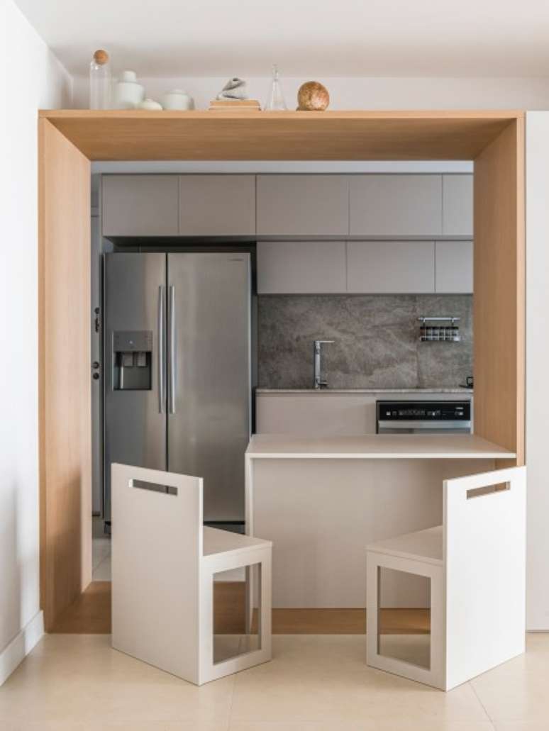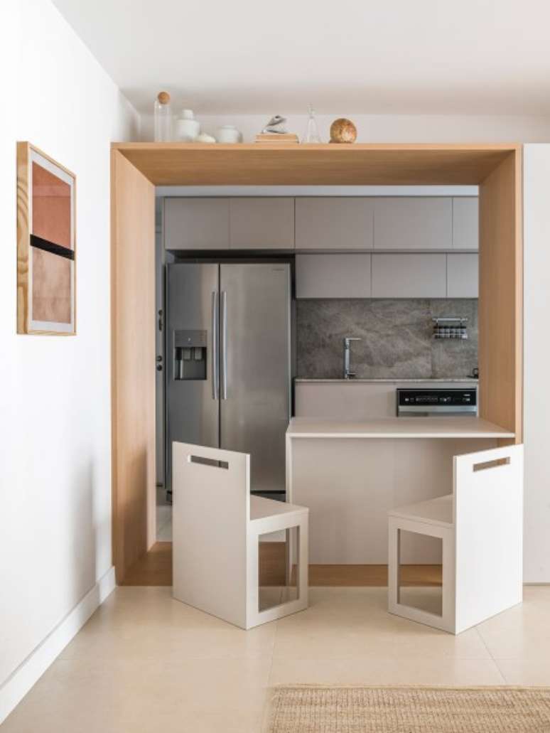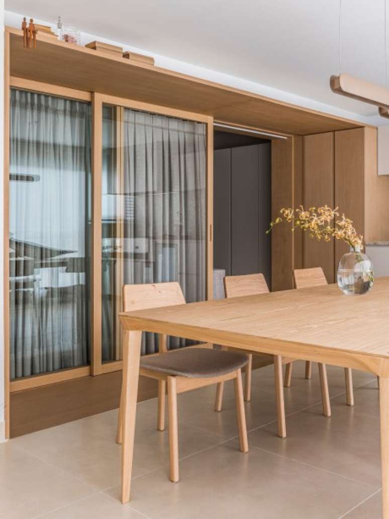 A caixilharia original da varanda, no entanto, foi trocada, o que gerou o partido e a identidade do projeto: "criamos um pórtico de madeira que divide a sala da varanda e que foi replicado também na divisória da cozinha e que foram complementados pela marcenaria", dizem os profissionais.