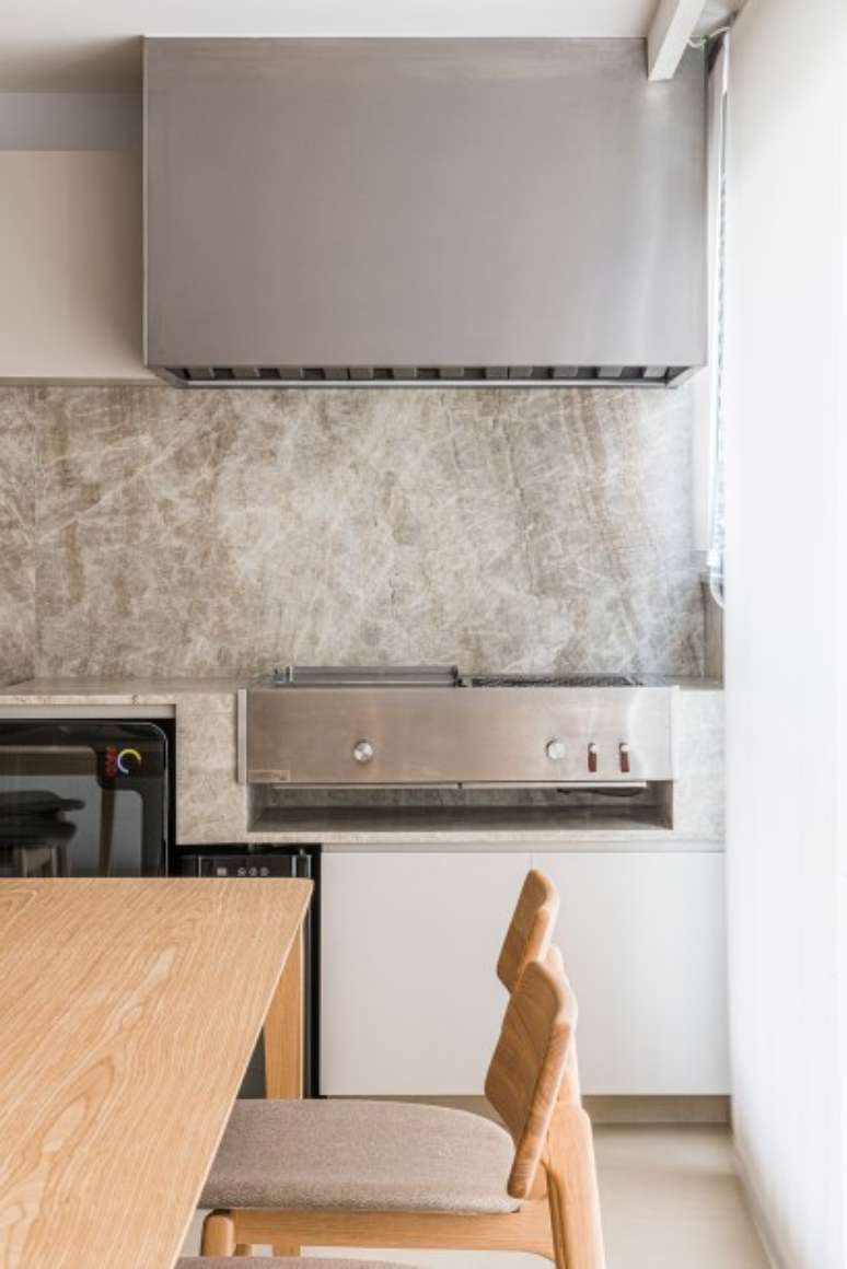 Poucos materiais compõem a paleta de revestimentos: piso de porcelanato, portas de madeira freijó e marcenaria feita de laminado melamínico. Para as bancadas, foi usado mármore Taj Mahal brasileiro.