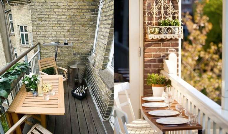 Para quem gosta de fazer suas refeições na varanda, nada melhor do que investir em uma mesa. Existem diversas opções, desde as dobráveis até as que imitam um balcão, tudo depende da sua preferência. As de madeira dão um charme rústico e romântico para a sacada, mas também existem opções de vidro, ferro ou plástico.