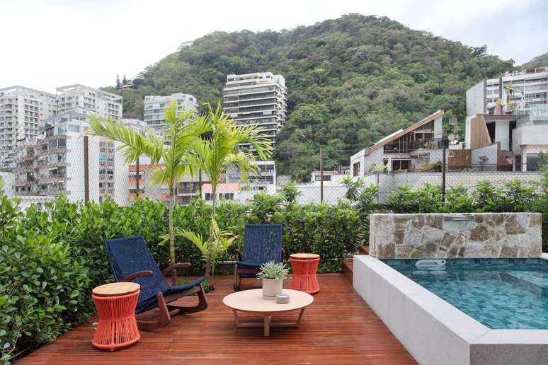 Na área externa do piso superior, a arquiteta destaca a incorporação das jardineiras externas do edifício à área do deck/piscina.