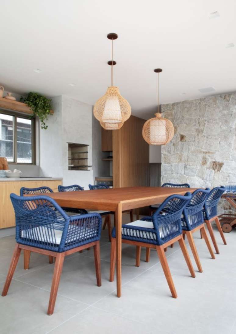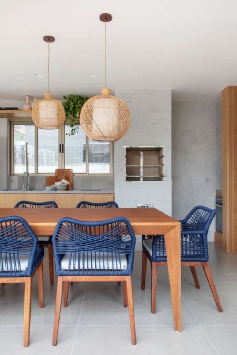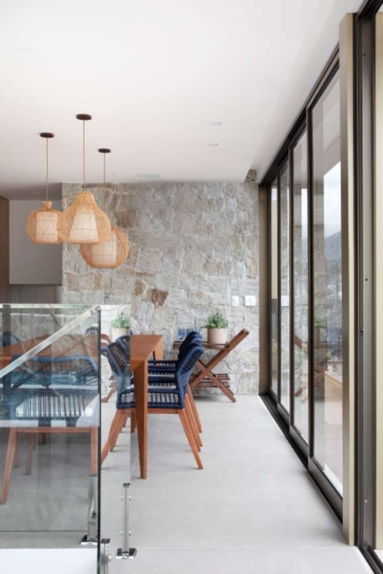 Além disso, ela integrou as varandas em todos os cômodos para ampliar os espaços internos, agora fechados com cortinas de vidro. No pavimento superior, a arquiteta otimizou o layout da suíte de hóspedes e da sala de tv. Na área gourmet, ela criou um nicho para acomodar o forno de embutir e, ao mesmo tempo, servir de depósito.