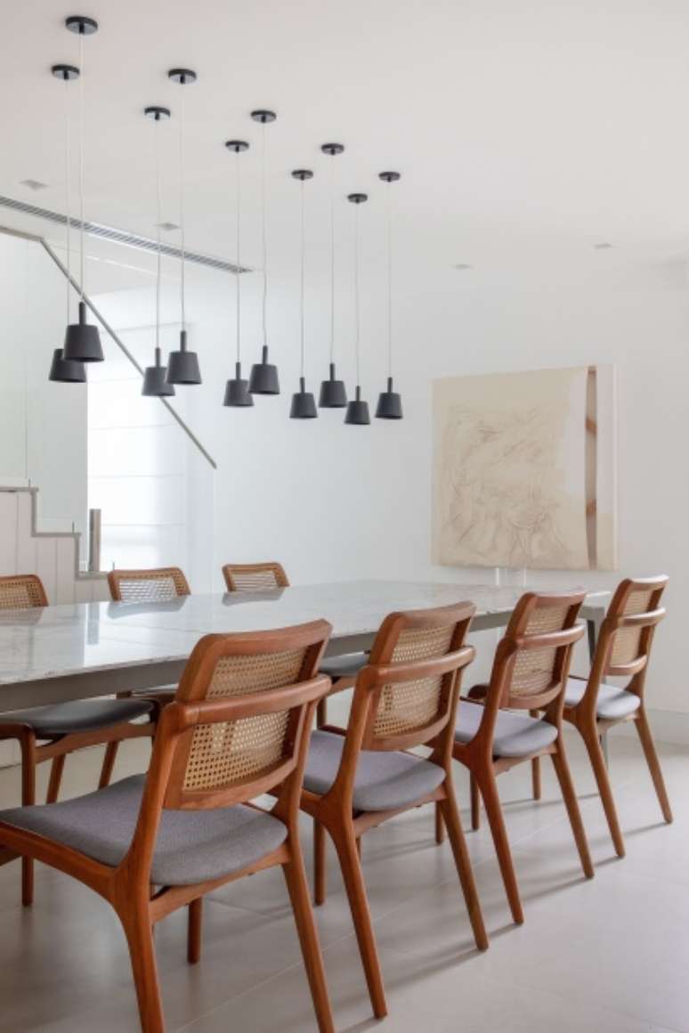 "Eles queriam criar espaços amplos, integrados e confortáveis no andar inferior para receber amigos e familiares, deixando a área íntima mais reservada, com as três suítes dos moradores, a sala de tv que também funciona como brinquedoteca dos filhos e o escritório. Já o segundo andar deveria concentrar a área de lazer, com espaço gourmet, piscina e sauna, além de uma suíte para hóspedes", conta Gabriela.