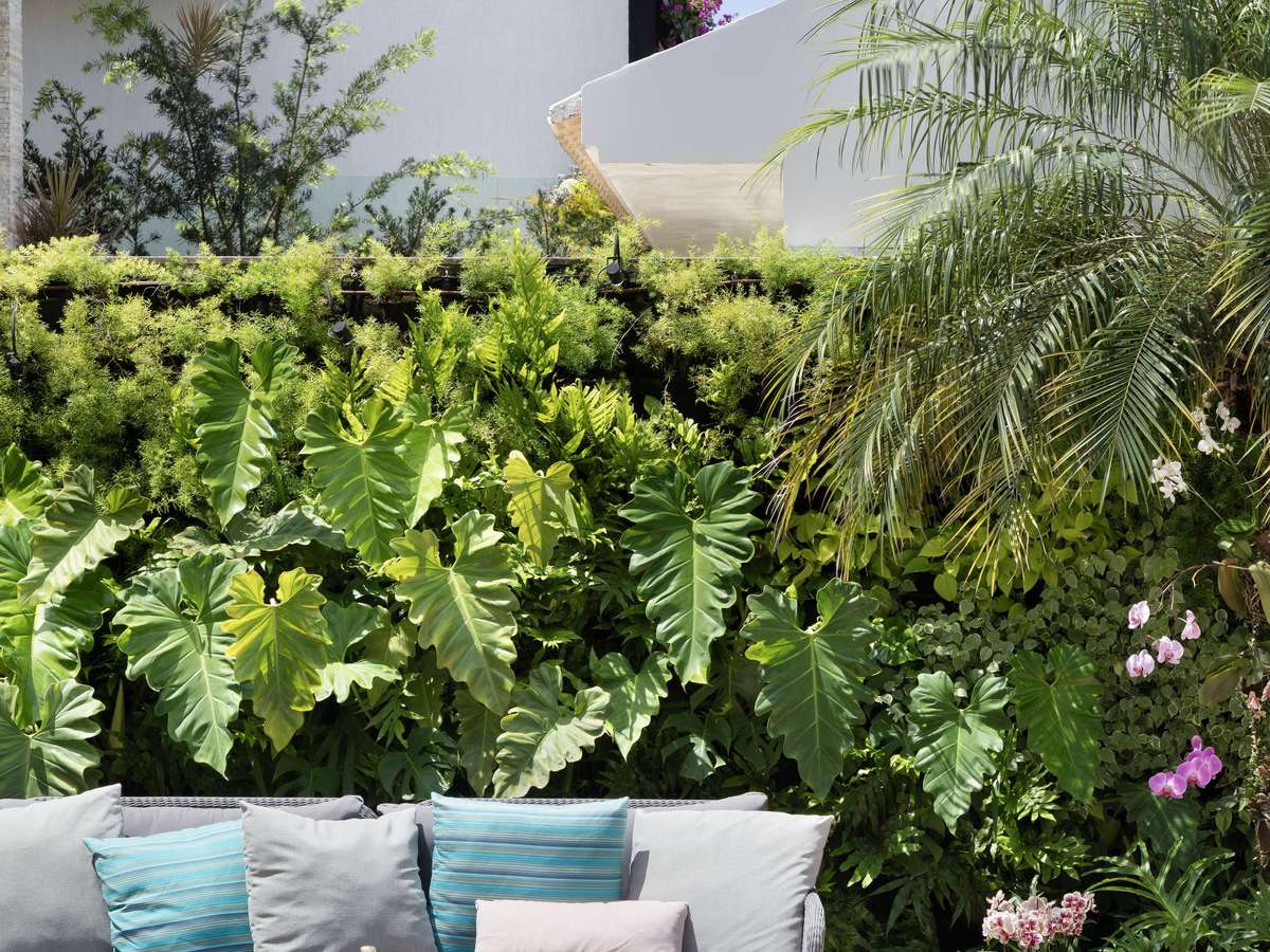 Segundo a paisagista, o projeto segue o estilo tropical, com muitas folhagens e texturas que se misturam de forma natural, como acontece na natureza, e aqui as espécies foram agrupadas de forma a delimitar o jardim da fachada, o jardim da entrada e a varanda coberta, além dos jardins verticais junto ao muro principal, voltado para a janela da sala e na lateral do pergolado da piscina.