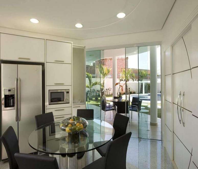1. Cozinha planejada com armários brancos e mesa redonda de vidro – Foto: The Holk