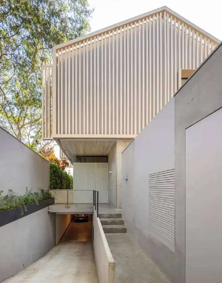 A arquitetura da residência que conta com 3 pavimentos e um rooftop (telhado) faz uma releitura das casas tradicionais que possuem uma estrutura com telhado duas águas. A fachada do imóvel é feita em perfis metálicos revestidos na parte frontal e traseira por uma placa laminada de alta pressão que possui grande durabilidade.