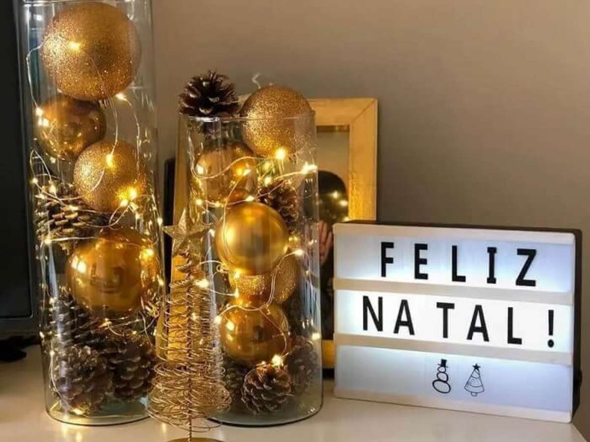 As luzes de natal trazem um toque intimista e aconchegante para a decoração natalina. Por isso, na hora de montar os seus arranjos de natal em vasos de vidro aposte no uso de fios de luz ou pisca-pisca combinados com outros elementos como pinhas, bolas de natal, ramos de pinheiro e flores.