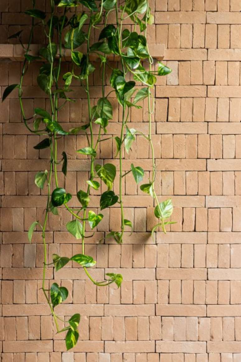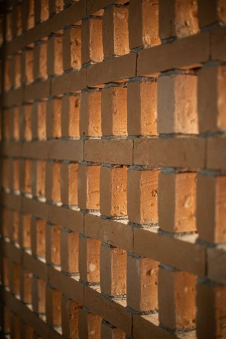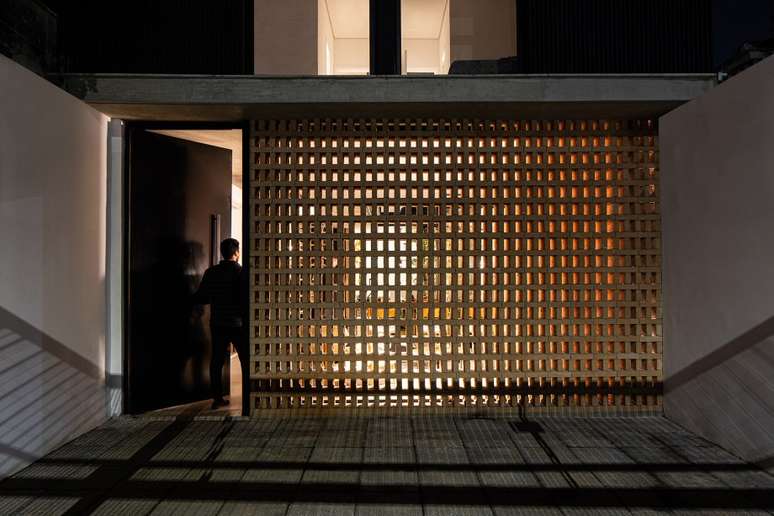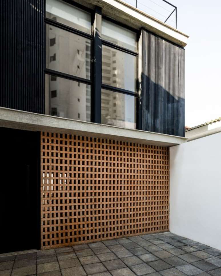 Na fachada frontal, voltada para a rua, a parede de tijolos maciços funciona como uma espécie de brise, alternando cheios e vazios por meio da sua paginação. Ainda no térreo, o lavabo e a lavanderia são mais fechados, definindo um volume único, com o emprego dos tijolos maciços, agora utilizados como fechamento interno.