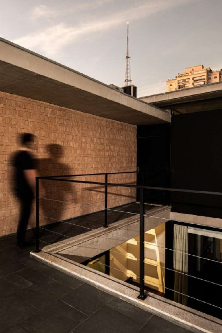 No segundo pavimento, está localizado um ambiente multiuso, parte bar, parte sala de TV, que se abre para a varanda externa, uma área gourmet com vista para a cidade, em direção ao parque. Sobre o gourmet, a laje de concreto aparente se projeta em balanço, como uma marquise.