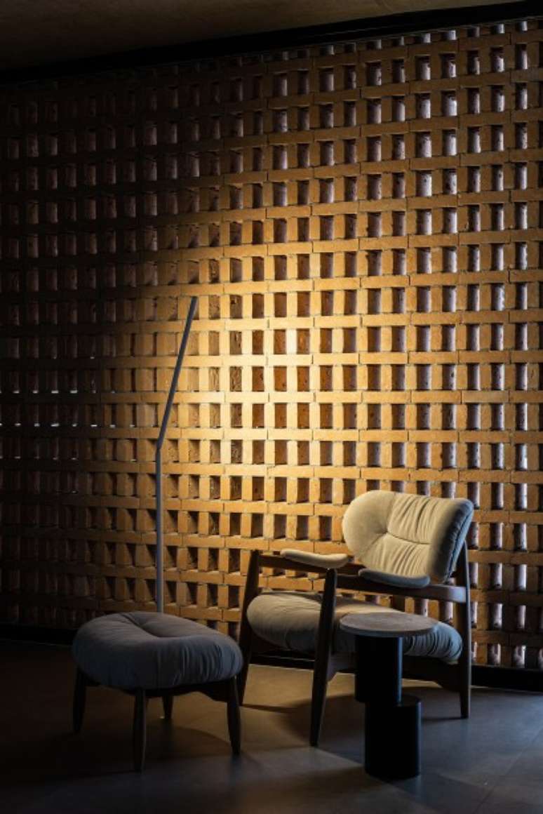 Além das lajes de concreto aparente, o tijolo maciço se tornou um importante elemento de identidade do projeto, contribuindo para tornar os ambientes mais acolhedores, através de sua tonalidade e textura. Nessa direção, o emprego da madeira, tanto no piso dos ambientes íntimos, como no desenho das marcenarias e na escolha do mobiliário também contribuíram para potencializar a sensação de conforto.