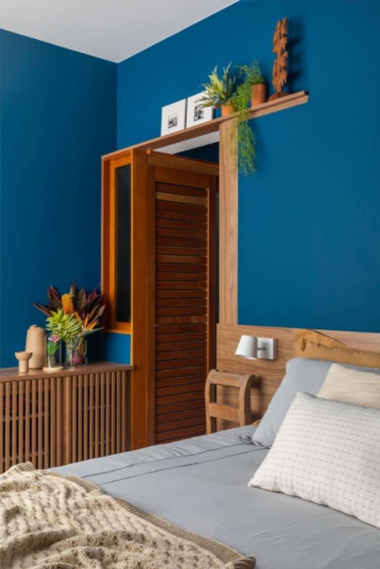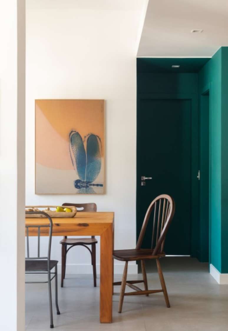 No quesito " paleta de cores e materiais", a cor verde, num tom forte, aparece em algumas paredes da sala e da cozinha, enquando a cor azul, também num tom forte, foi aplicada nas paredes do dormitório do casal. Para não pesar visualmente, foi escolhido para o piso um porcelanato de formato grande com tom neutro e claro e aparência de cimento queimado.