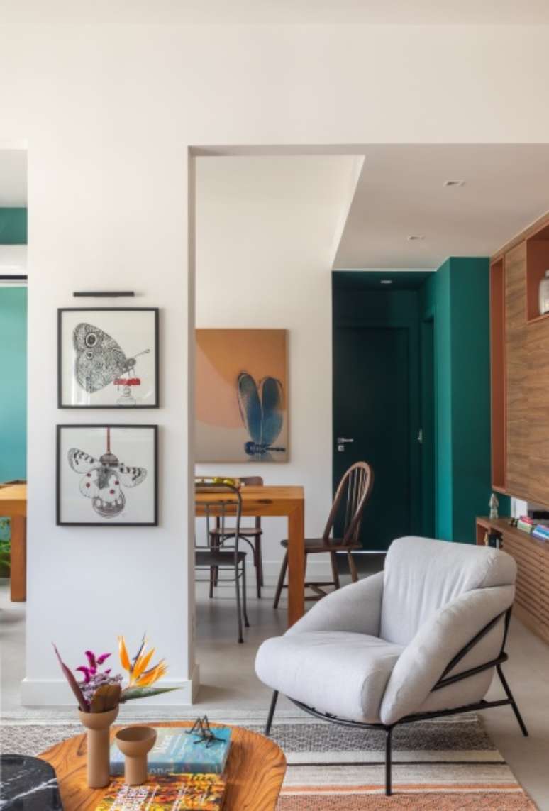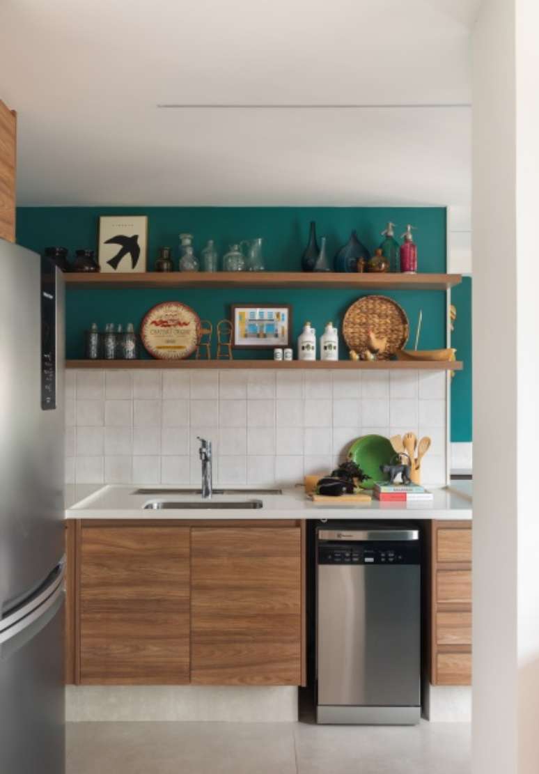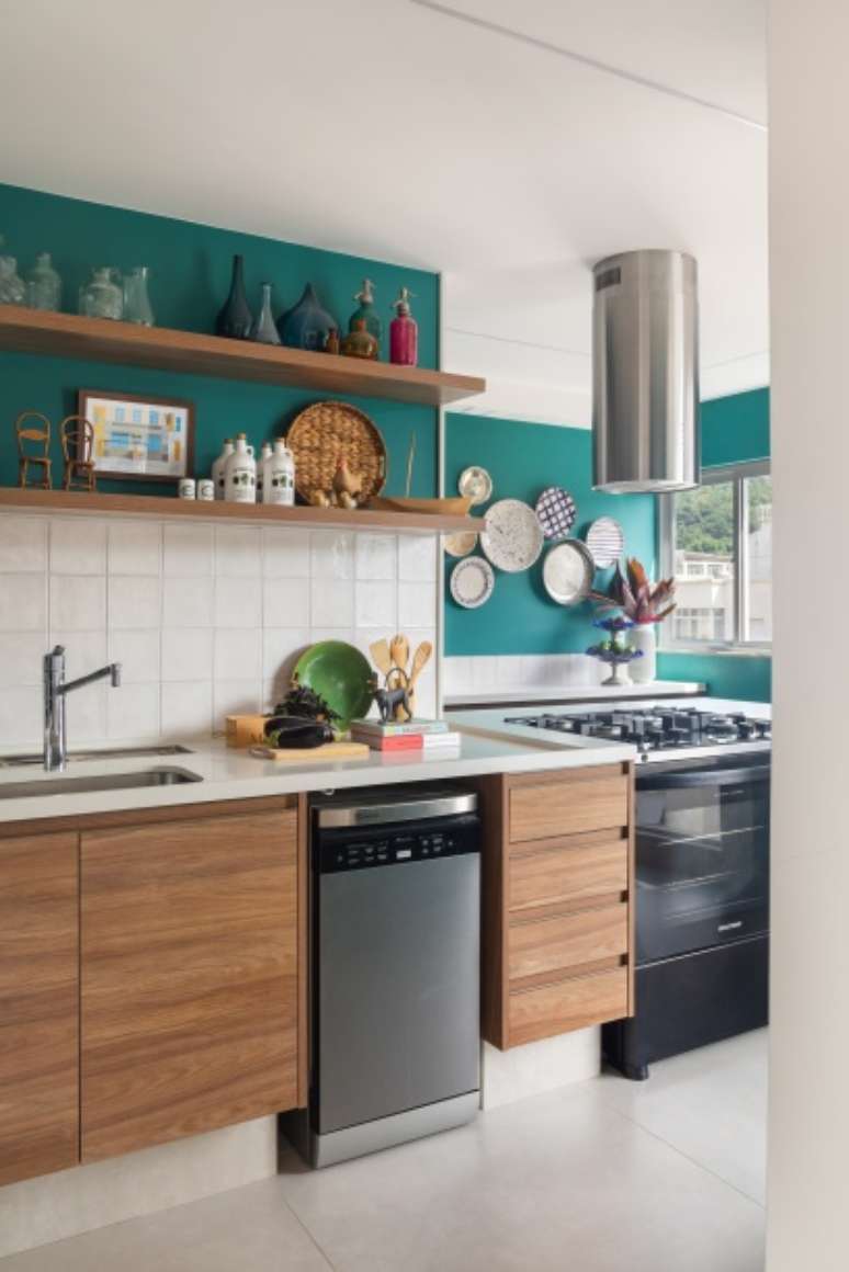 Azul e verde marcam apê de 81m² com cozinha integrada e bancada espaçosa